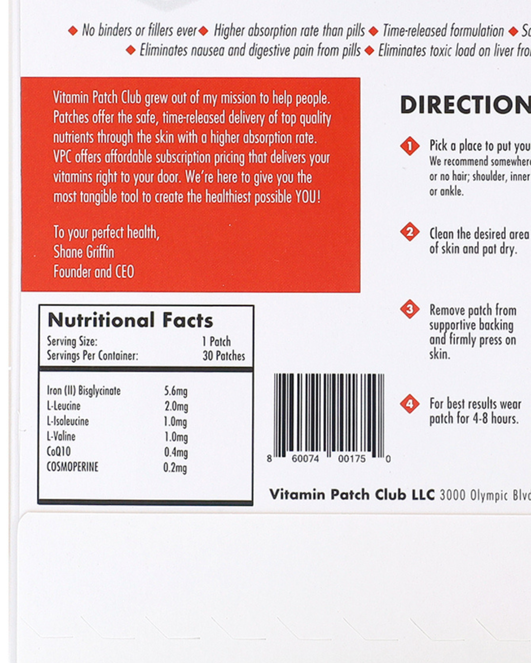 Combined with key amino acids like L-Leucine, L-Isoleucine, and L-Valine for muscle growth and recovery, plus CoQ10 to support energy and fight oxidative stress, this patch keeps your body performing at its best. Just peel, stick, and power through your day.