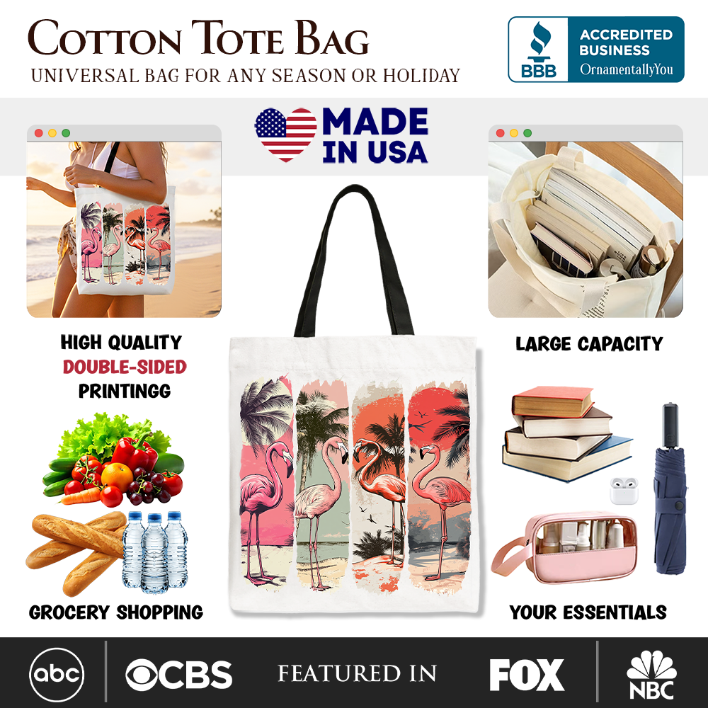 Summer Flamingo Beach Canvas Tote Bag, Retro Vacation Tropical Sunset Gift Shopper