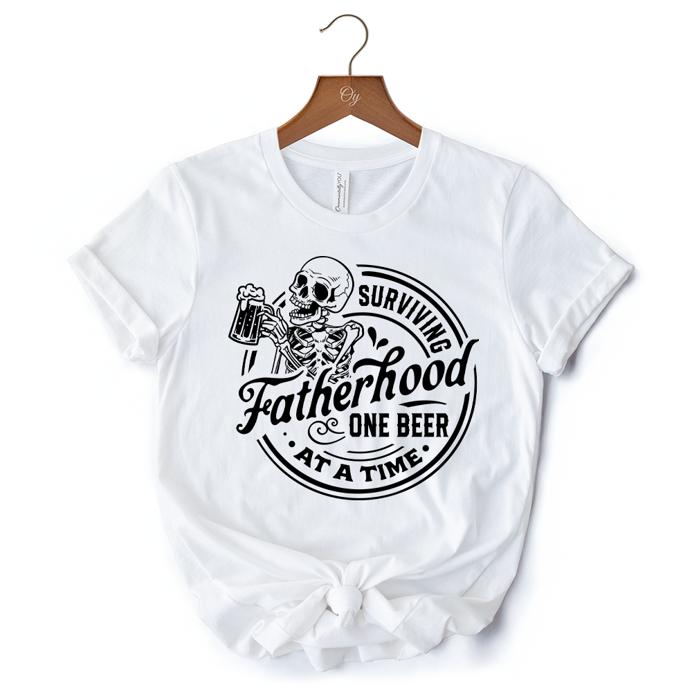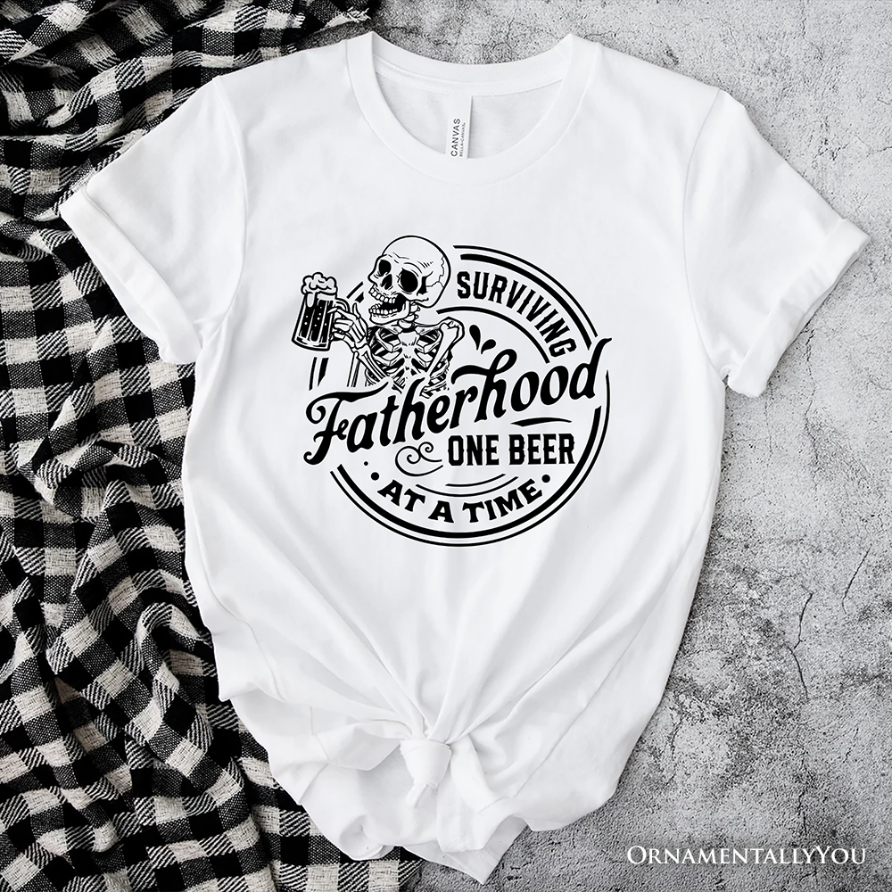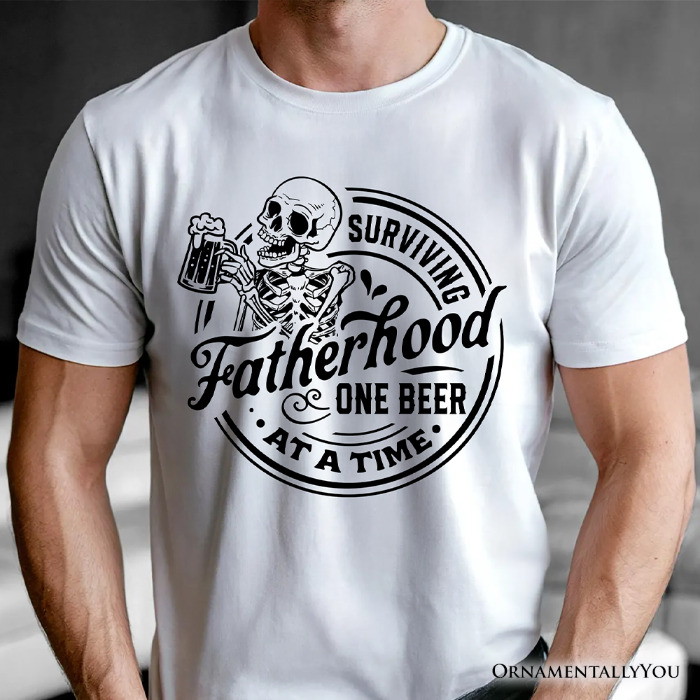 Surviving Fatherhood Skeleton Beer T-Shirt, White Vintage Tee for Tired and Hilarious Dads