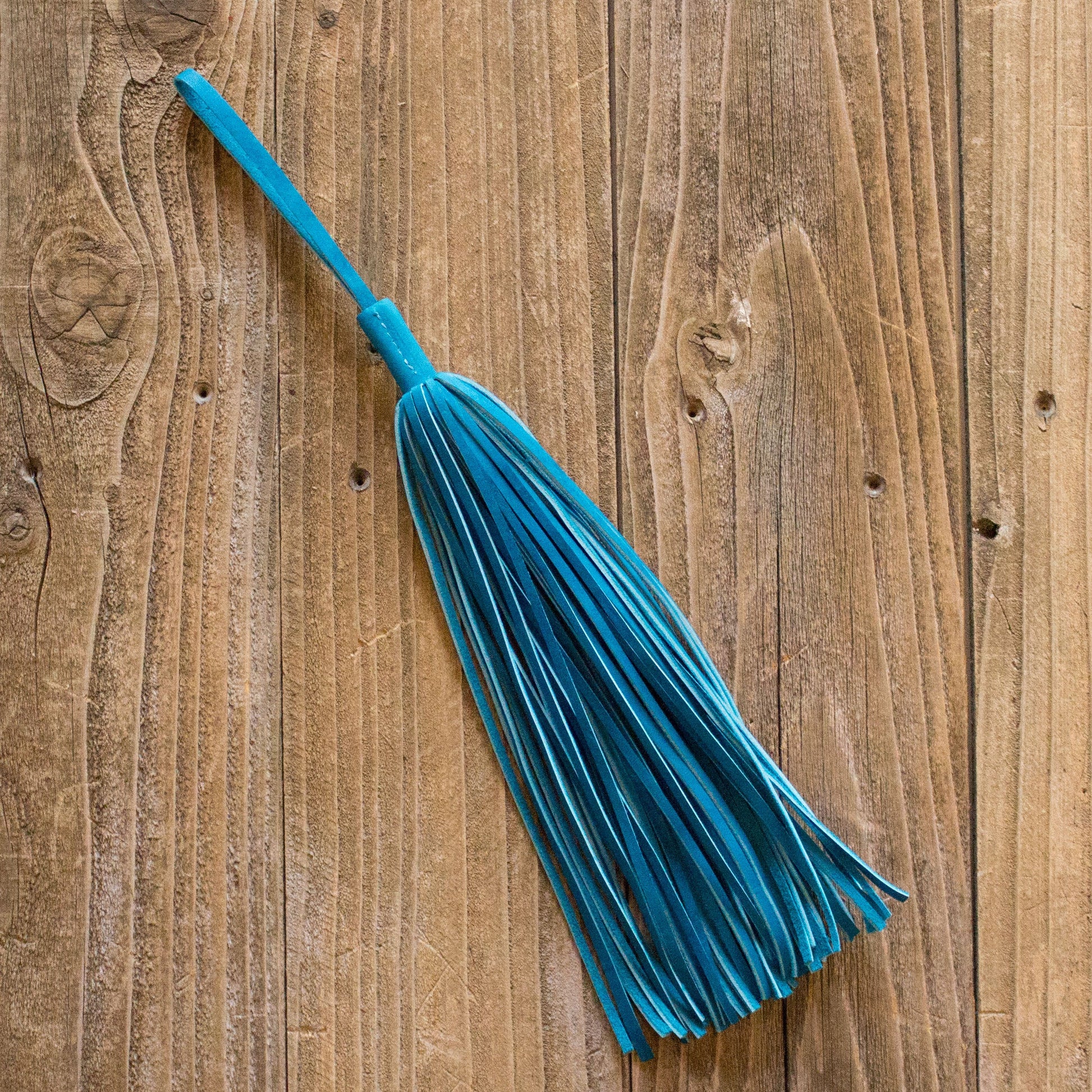 A teal leather Tassel that will enhance the personality of any bag. Designed to loop onto almost any strap or handle. Tassel is approximately 12" long.