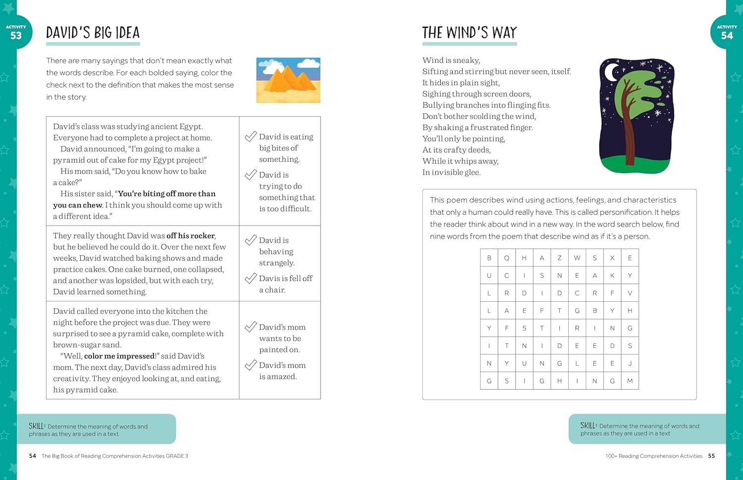 Filled with fun stories, crosswords, fill-in-the-blanks, and so much more, this book teaches reading for 3rd graders through activities that start simple and grow more difficult as your child progresses.