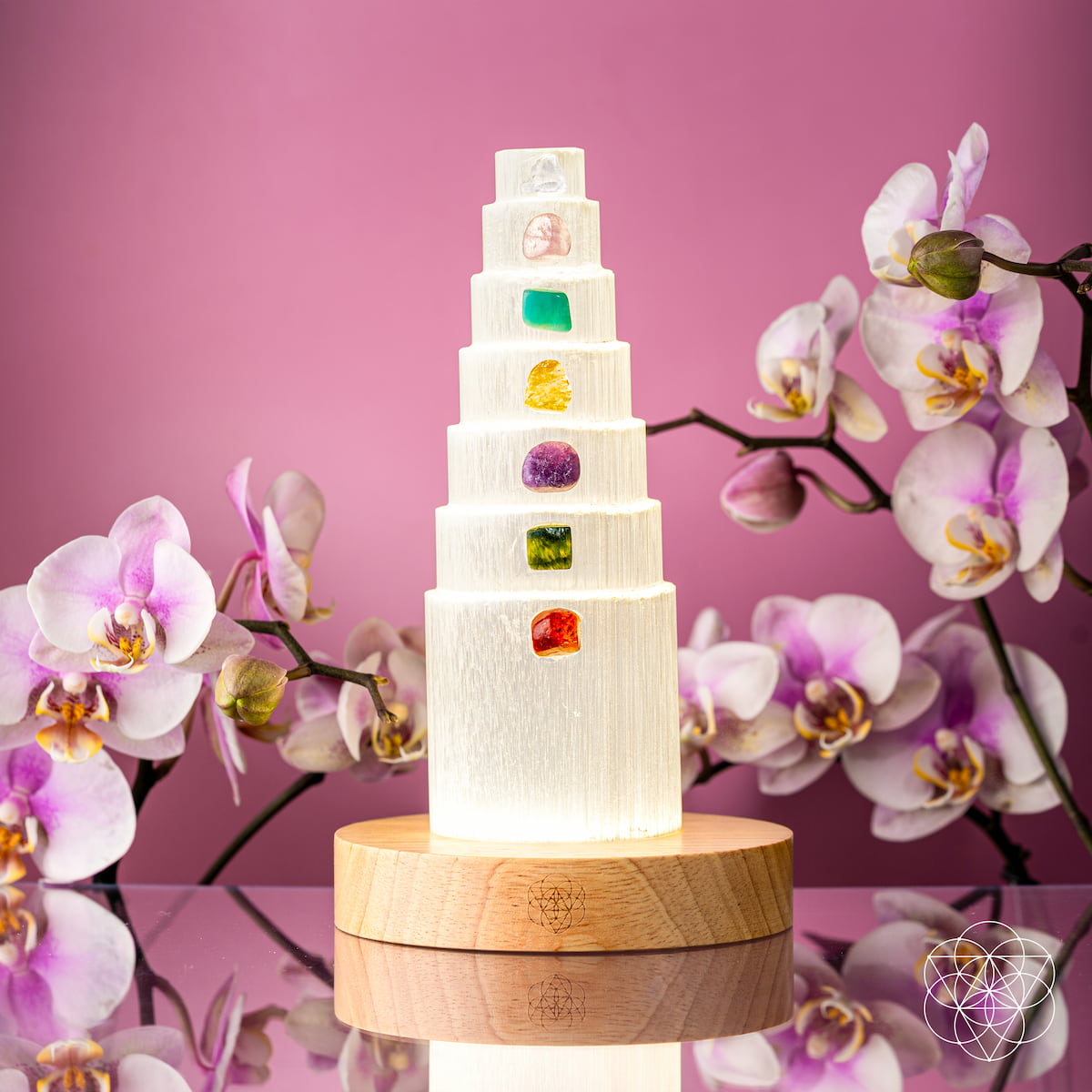 Everything is anchored by a Selenite foundation, which rises from the lamp’s wooden base. Selenite seeks to cleanse and magnify all seven high-frequency crystals. Now tension-filled rooms may become sanctuaries of calm, protection, and golden light.