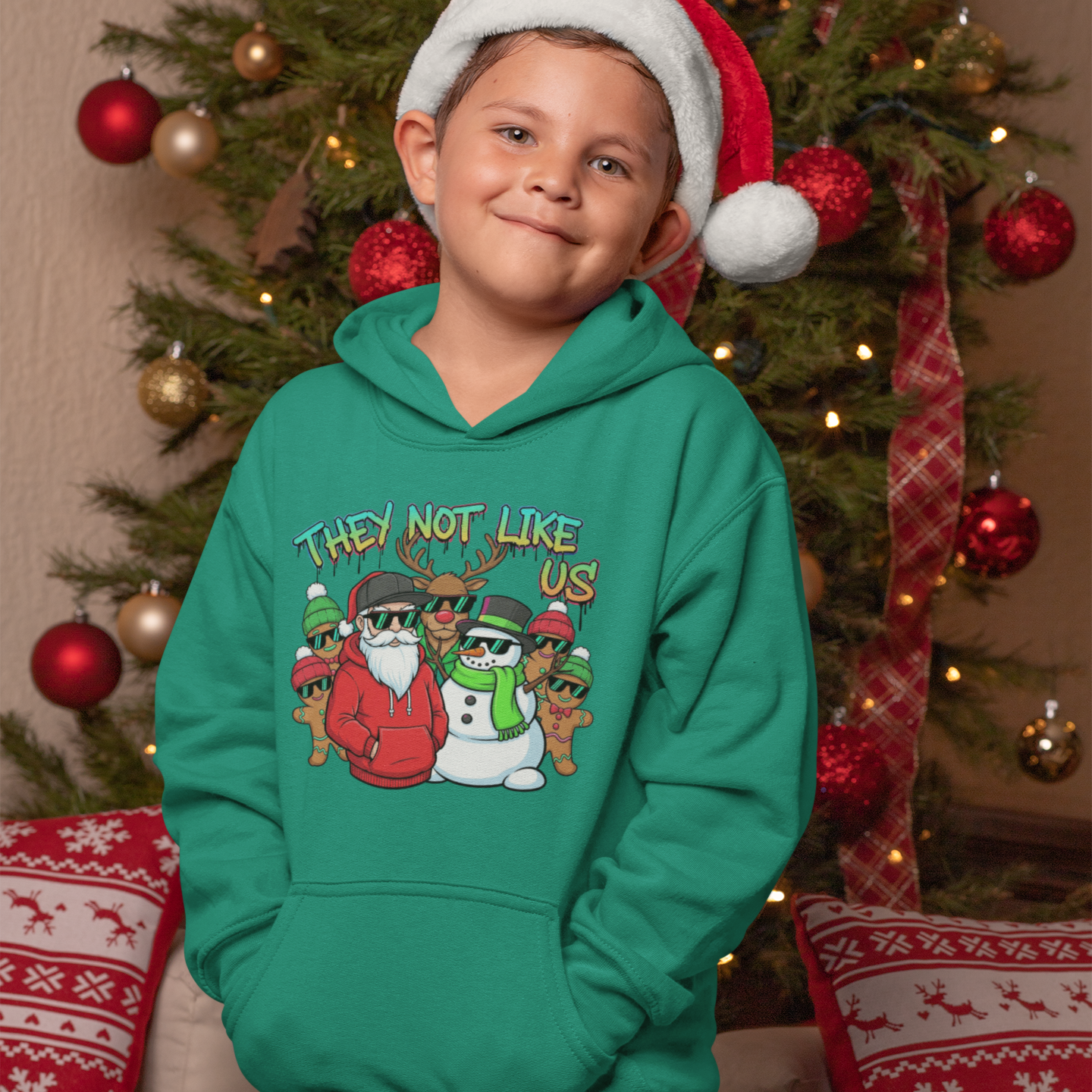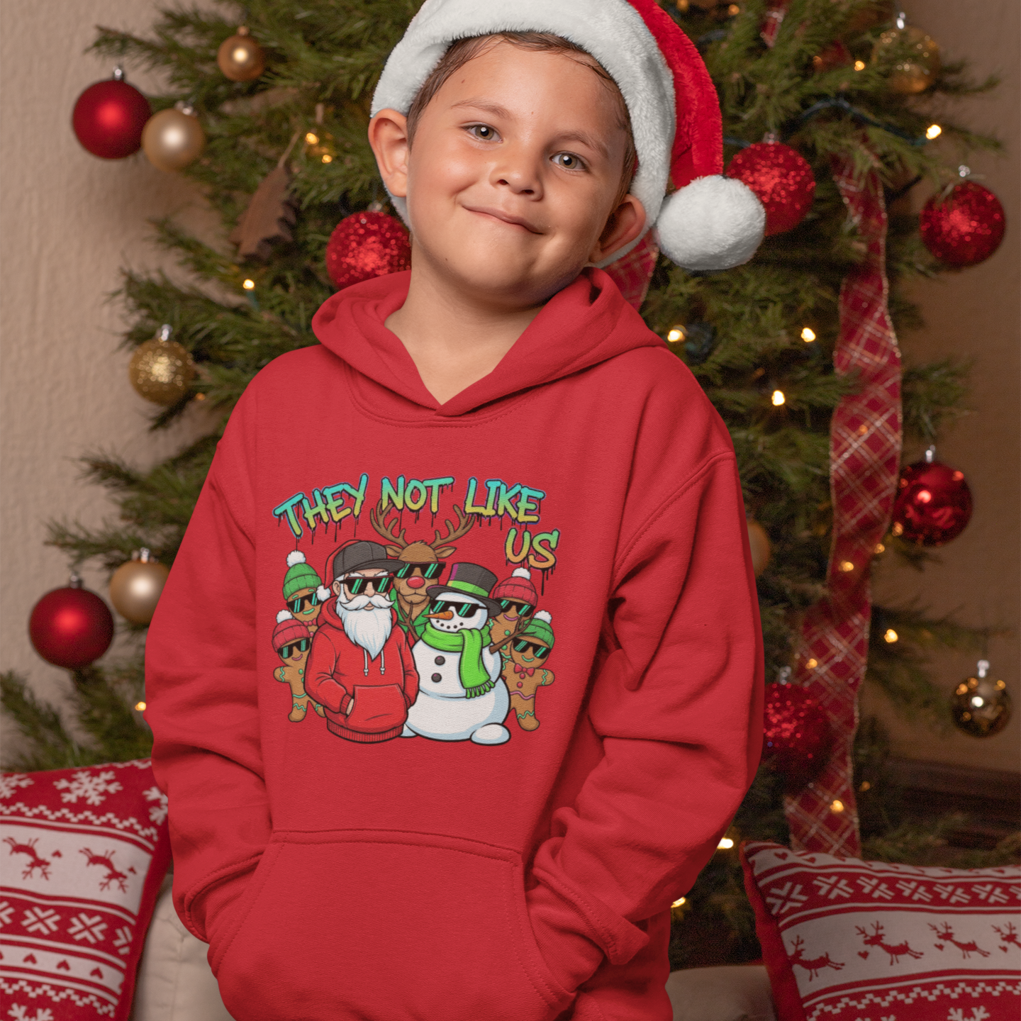 They Not Like Us Youth & Toddler Hoodie This hoodie flips the script on traditional holiday wear with edgy street-style vibes and a roster of classic Christmas characters—Santa, Frosty, and friends—reimagined with attitude. Perfect for kids who want to stand out during the season, it blends nostalgic holiday charm with contemporary cool. Bold graphics and confident messaging make this the go-to piece for young trendsetters ready to show their crew is built different this winter.