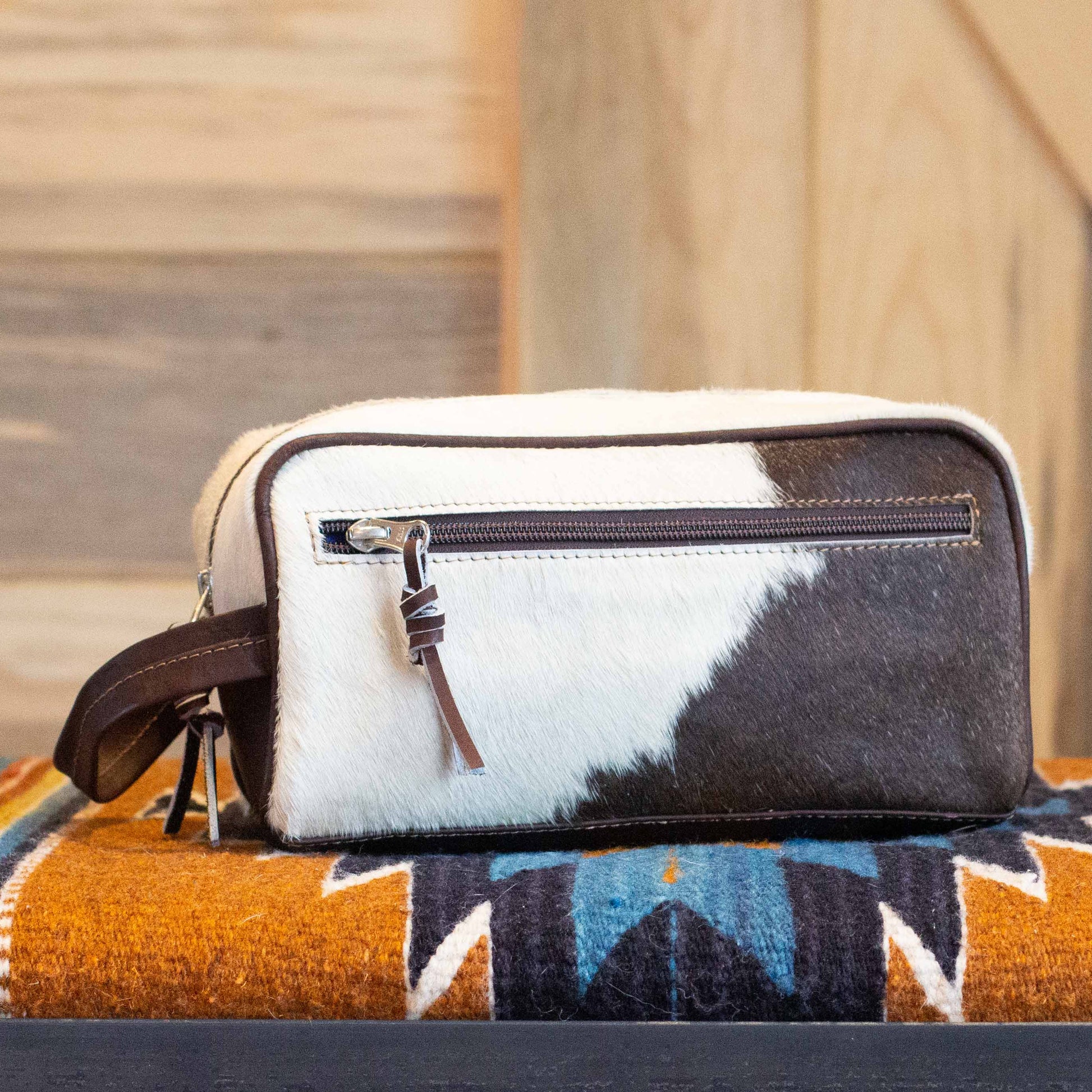 Go ahead and bring that full tube of toothpaste...you'll have plenty of room with our cowhide Toiletry Bag!