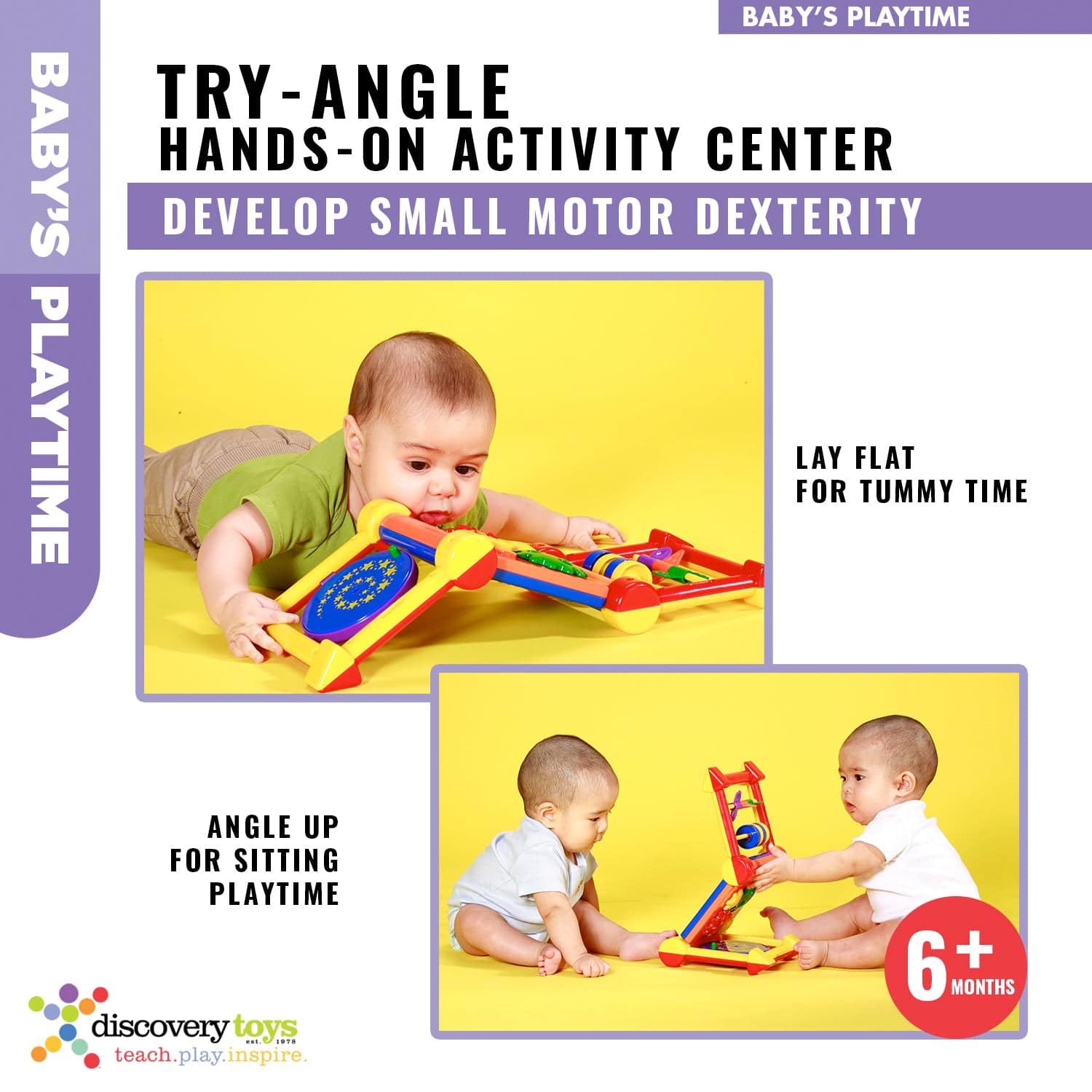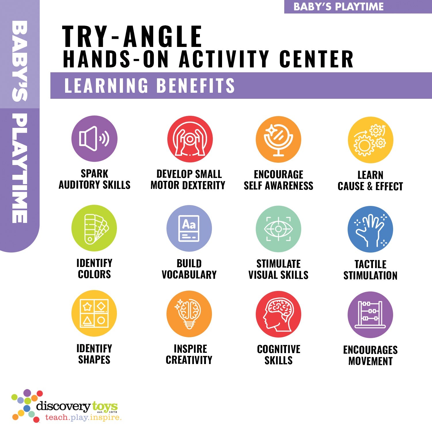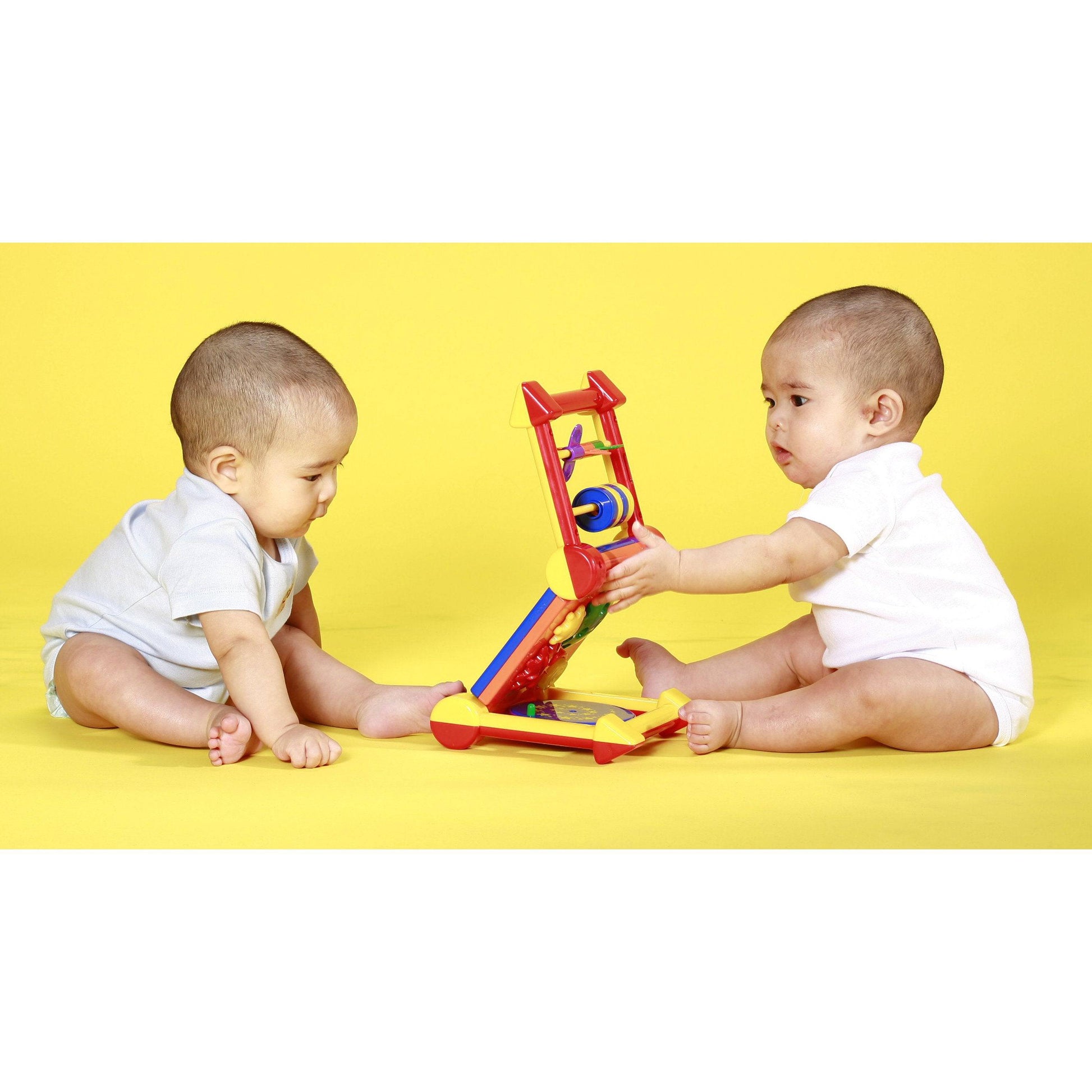 Twist, turn, whirl and twirl! Loaded with activities for baby to explore, this portable, foldable hands-on play center is a world of sensory wonder. Featuring 5 sides, each with different colorful parts to observe, listen to, and manipulate. Unique folding design to grow with baby: