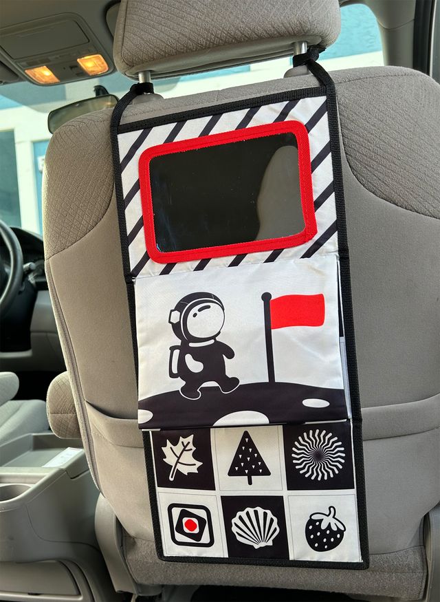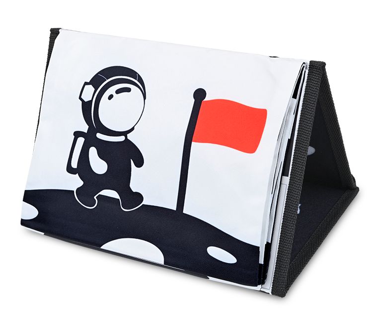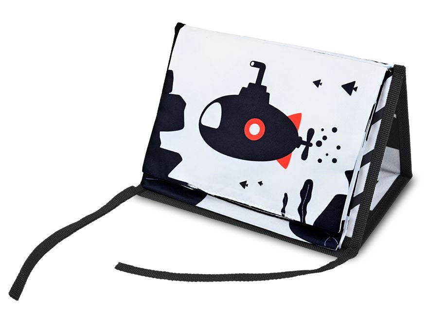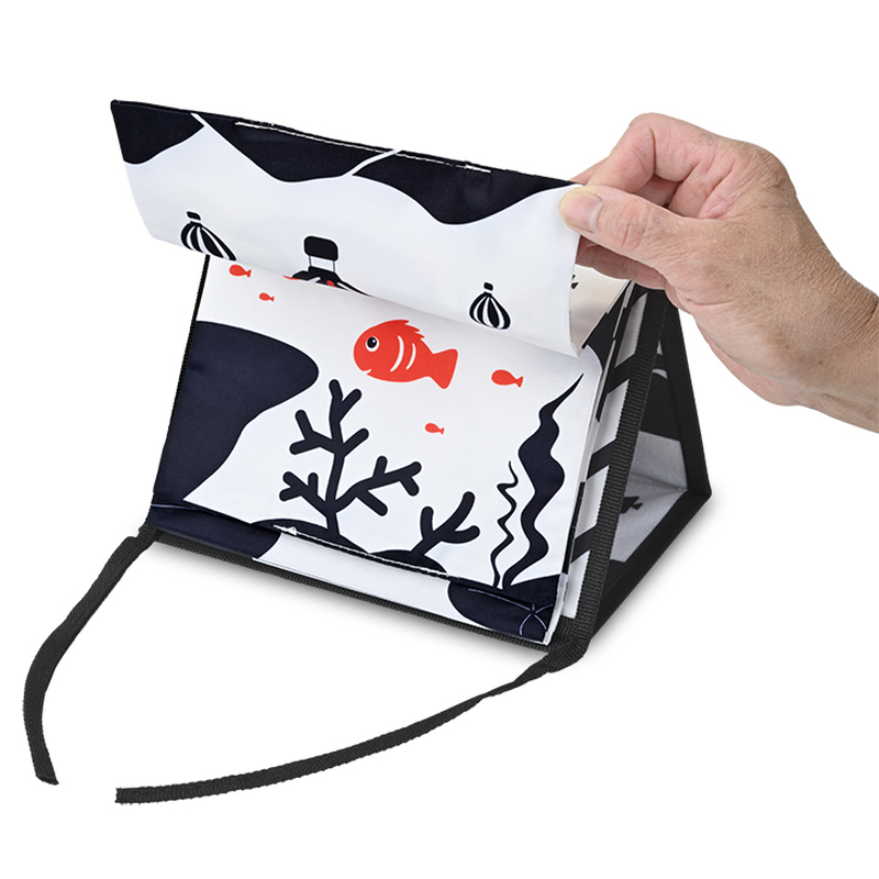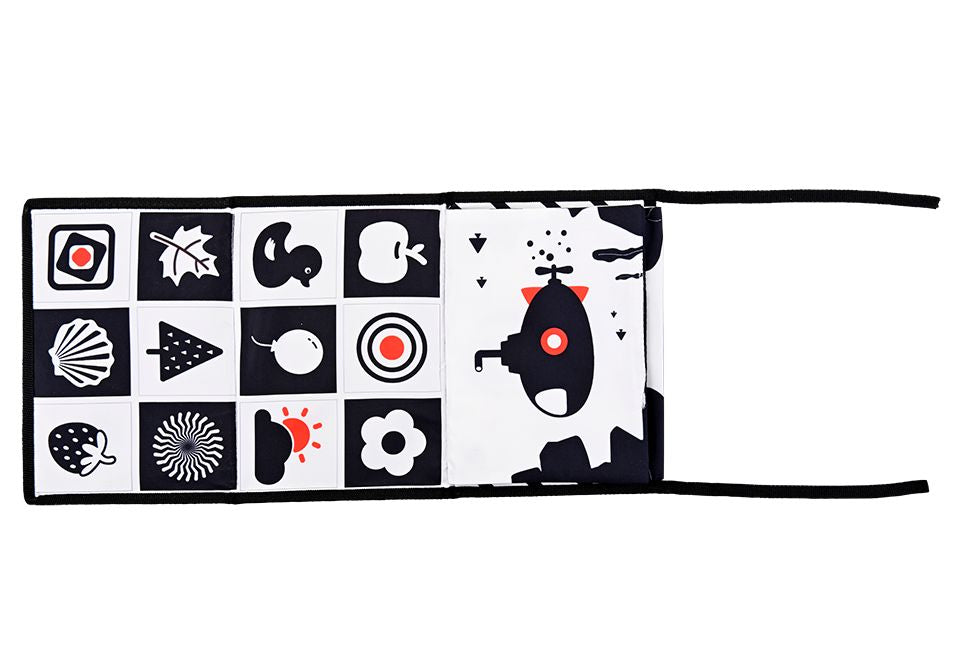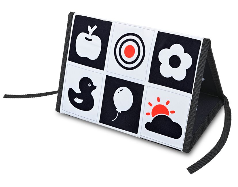 Kickstart baby’s visual development with this unique multi-format collection of engaging black, white and red images. It can be hung, laid flat, or folded in a triangle shape within baby’s visual range. The different textured fabrics, crinkly pages, and bonus mirror will also aid in baby’s auditory & tactile development and self-awareness.