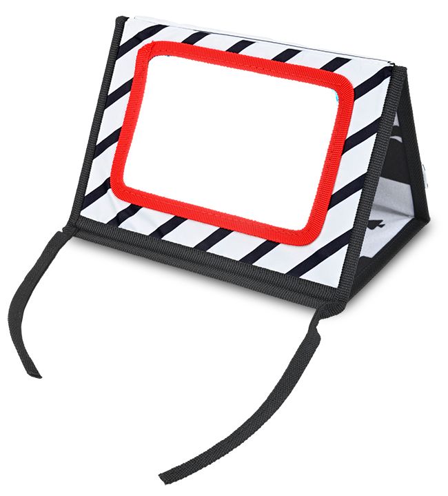 Tie the attached straps to a top crib rail or adult car seat within baby’s sight. The large bonus mirror will aid in developing self-awareness and facial expressions. 17.7” x 8.5” (45 x 21.5 cm) flat.