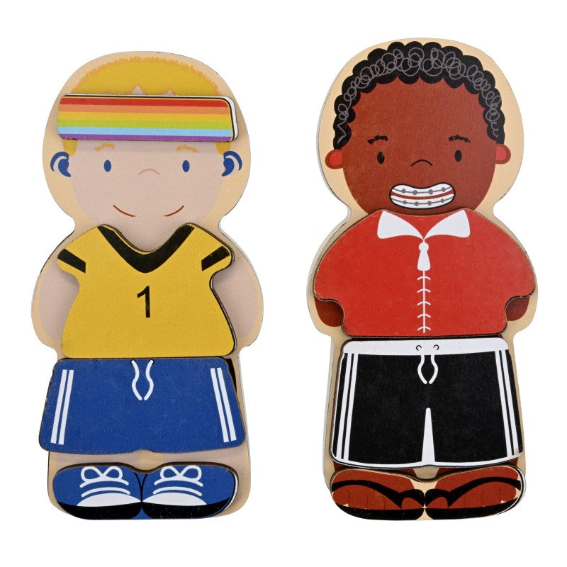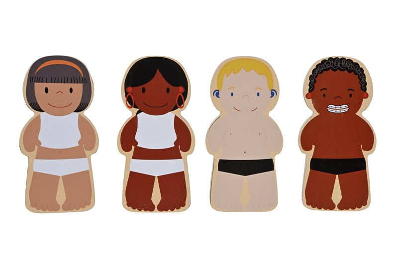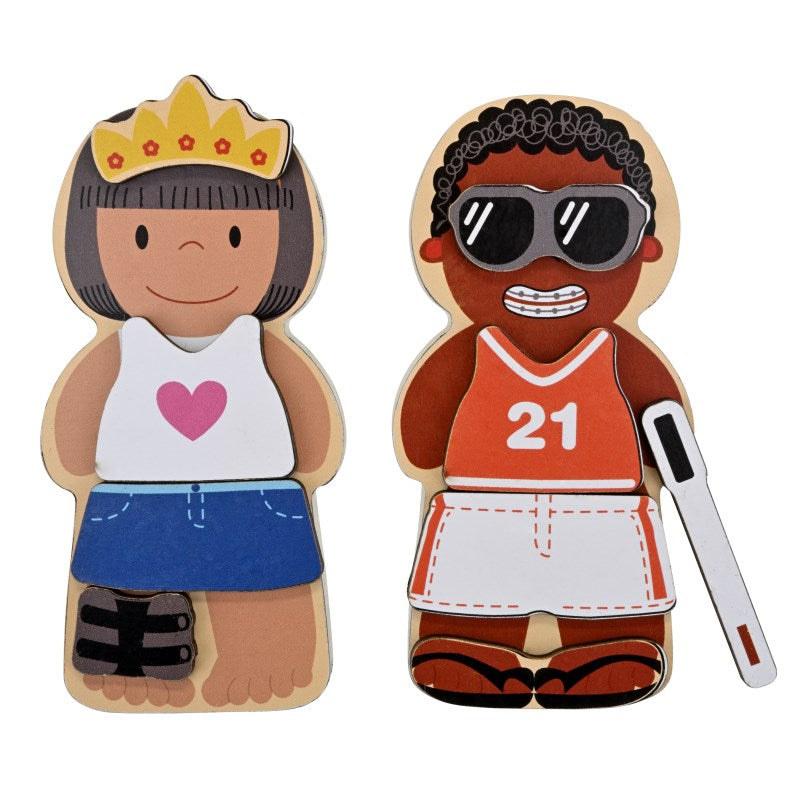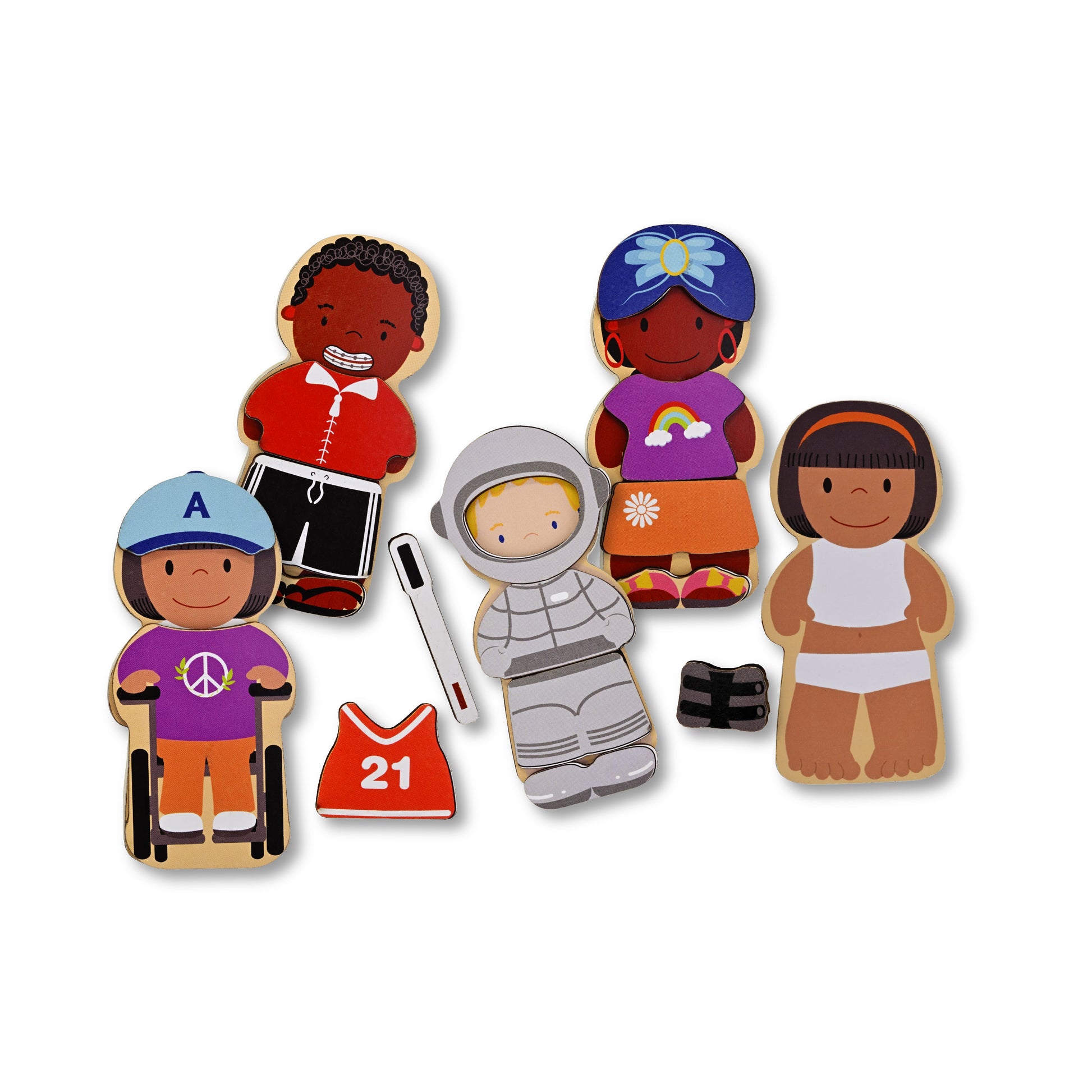 This versatile magnetic dress-up activity set made of wood is designed to celebrate diversity in various forms, including different physical abilities. Includes 4 large, chunky children figures (4.5 inch/11.5 cm tall and 0.5 inch/1.3 cm thick) of various ethnicities.