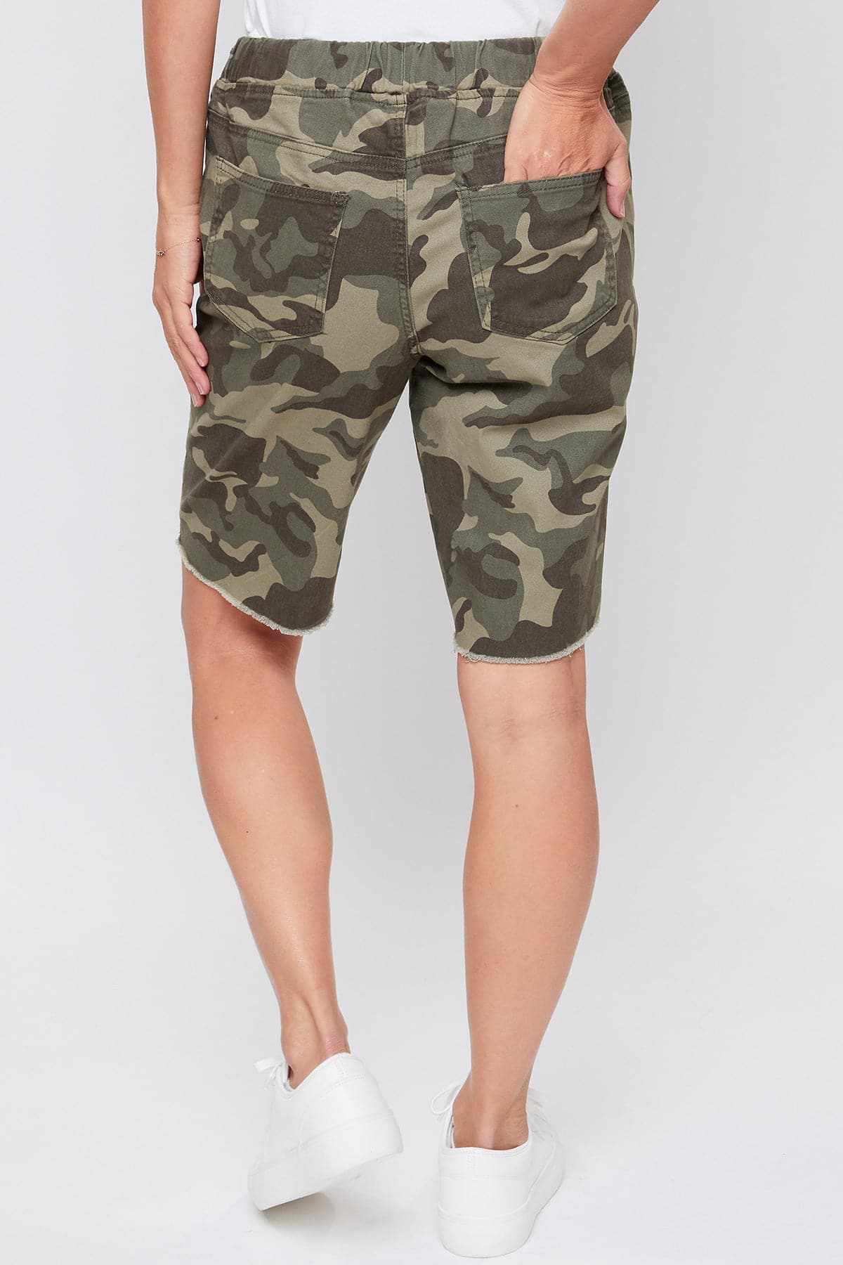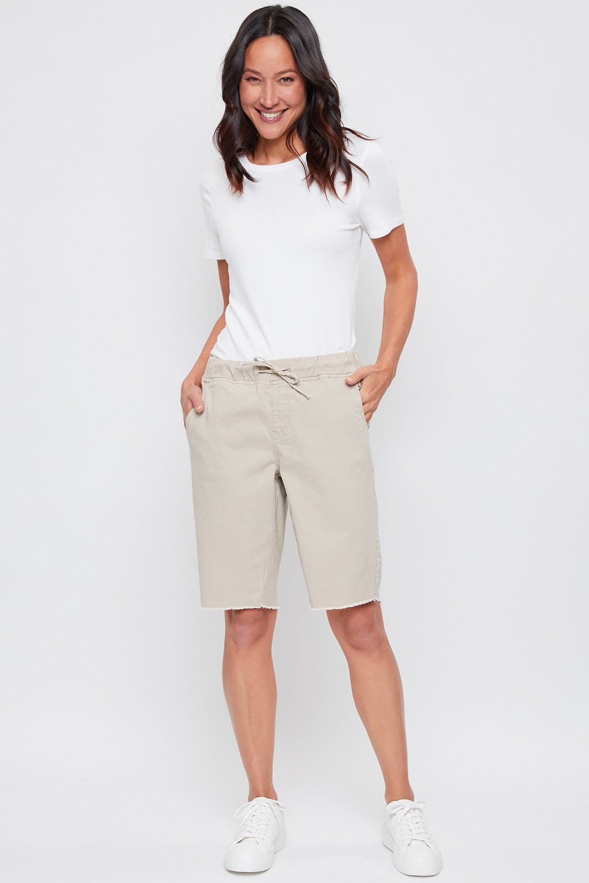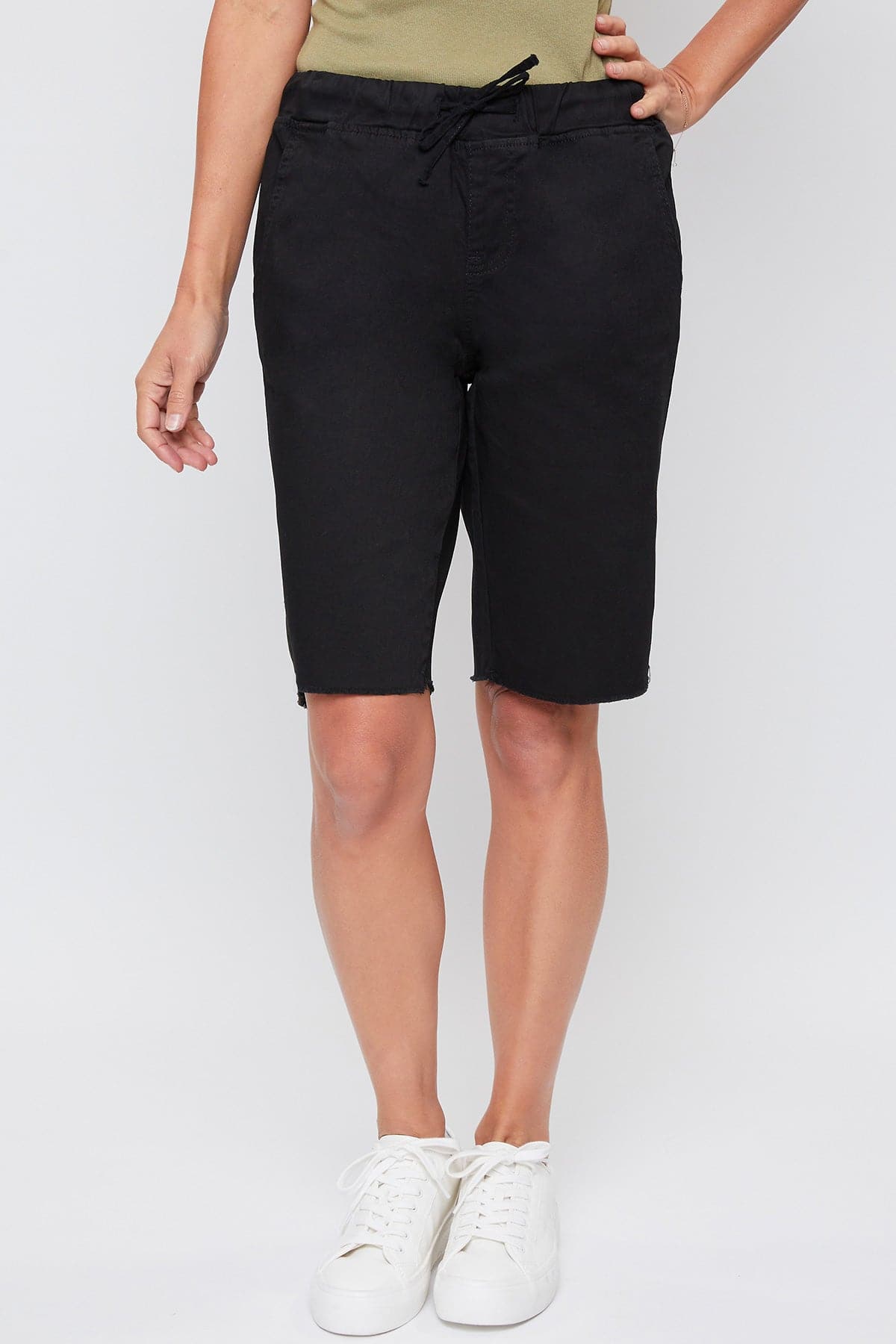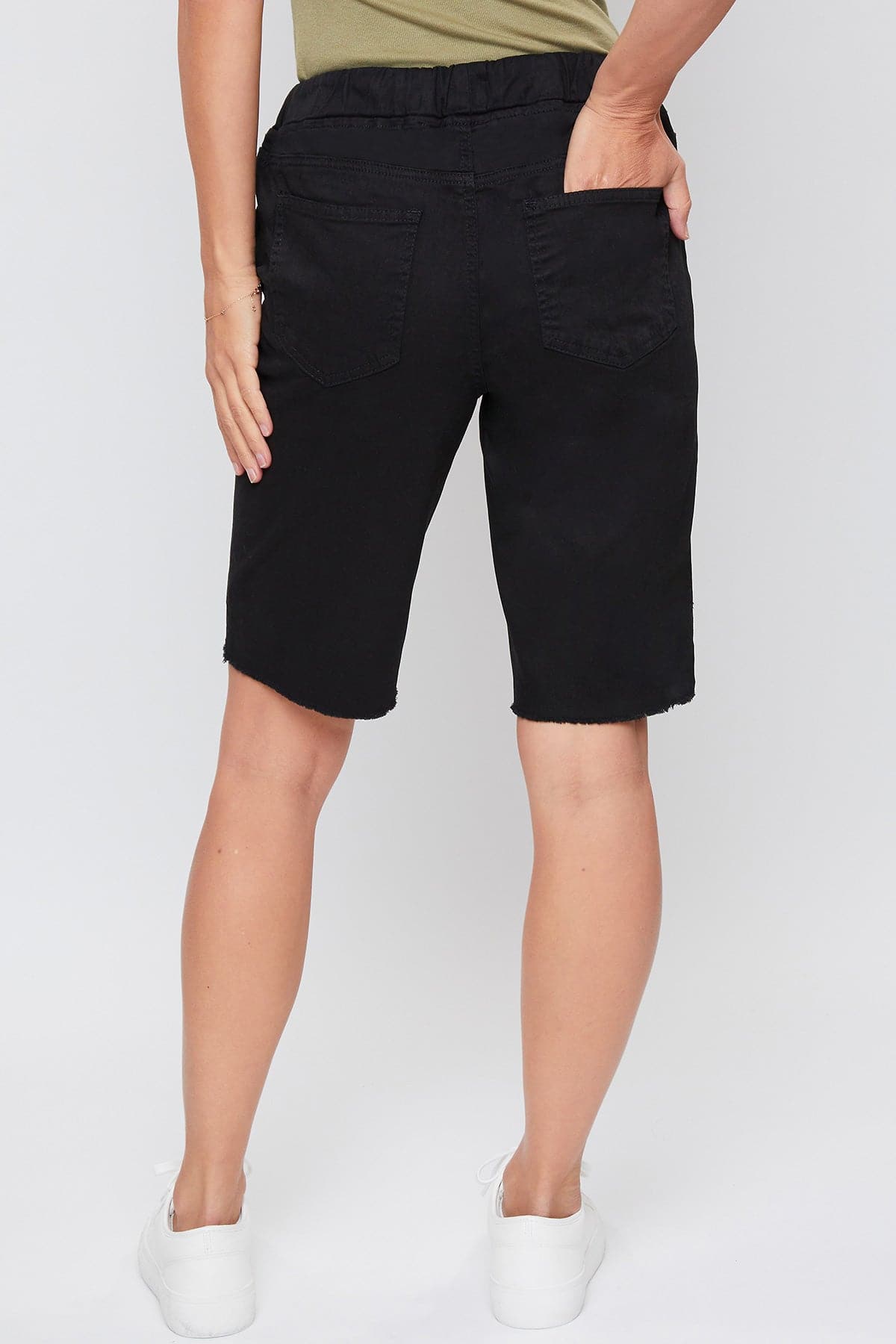 Our Missy Elastic Bermuda with Fray Hem is Designed for a comfortable all-day fit with an elasticized waistband with drawstring and made with a breathable and lightweight material. Featuring two front pockets and two back pockets for convenience and ease. These hit right above the knee and have frayed hems.