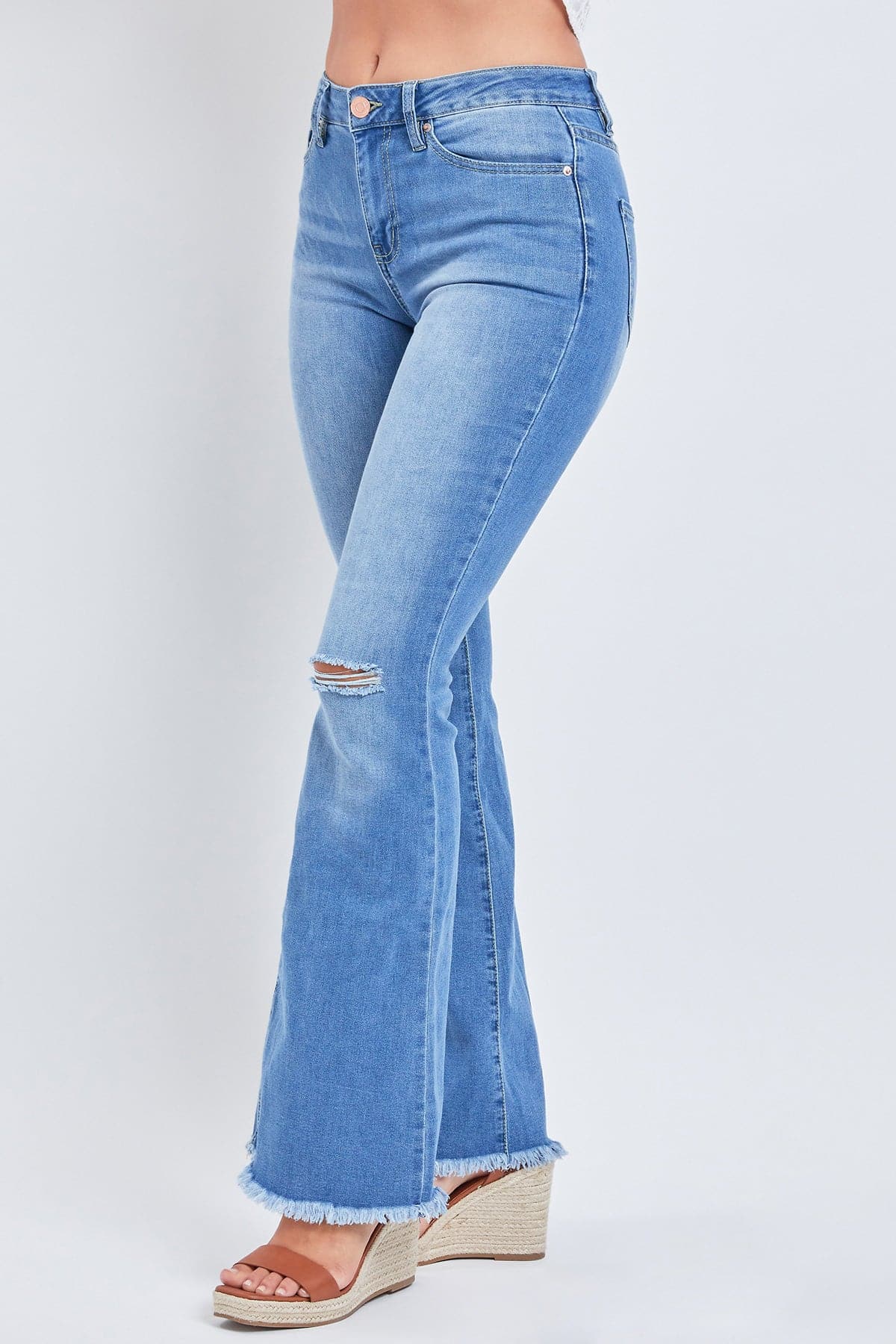 Retro is back and we’re all about it! Bring some flirt and flair to any look with our Women's 1-Button High-Rise Fray Hem Flare-Regular Inseam. Get the look of vintage with this perfect 70s-inspired, flare silhouette, but get all the comfort in our soft and stretchy denim. This slim-to-flare leg is designed to lean and elongate your legs, while flattering your every curve. Pair them with sneakers for a casual vibe, or dress up with strappy heels or booties!
