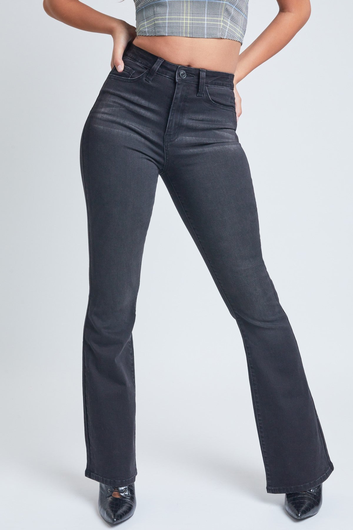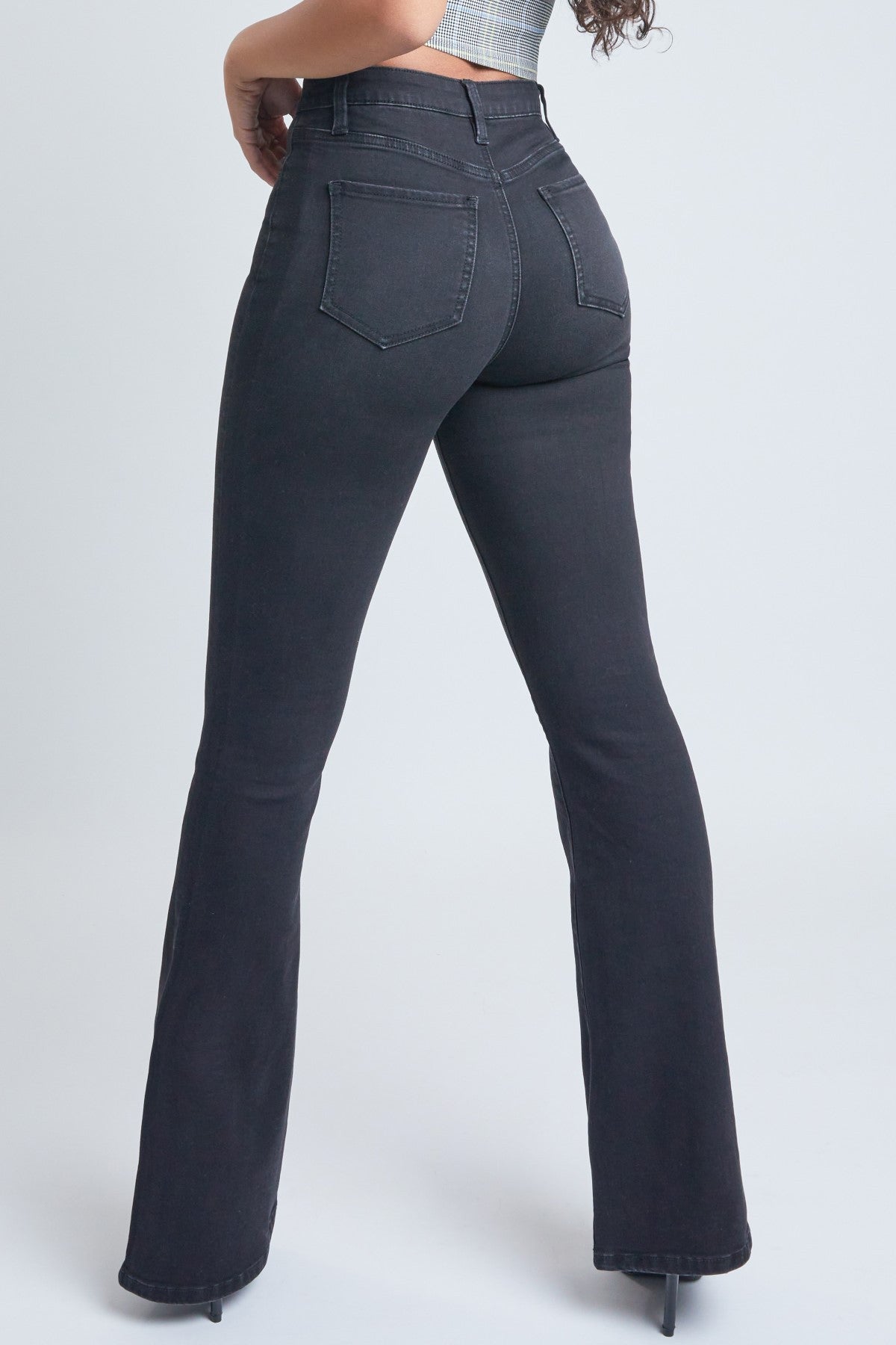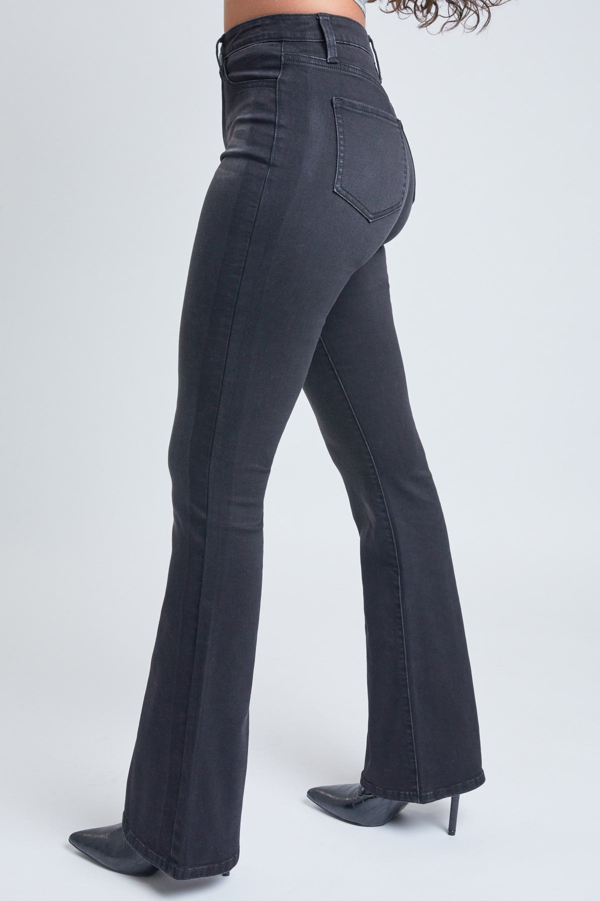 The Women's High-Rise Flare Jeans With Shadow Side Panel are designed with a super high-rise, single-button closure with front zip, classic five pocket construction, a super trendy flared fit with shadow side panel design, and belt loops.