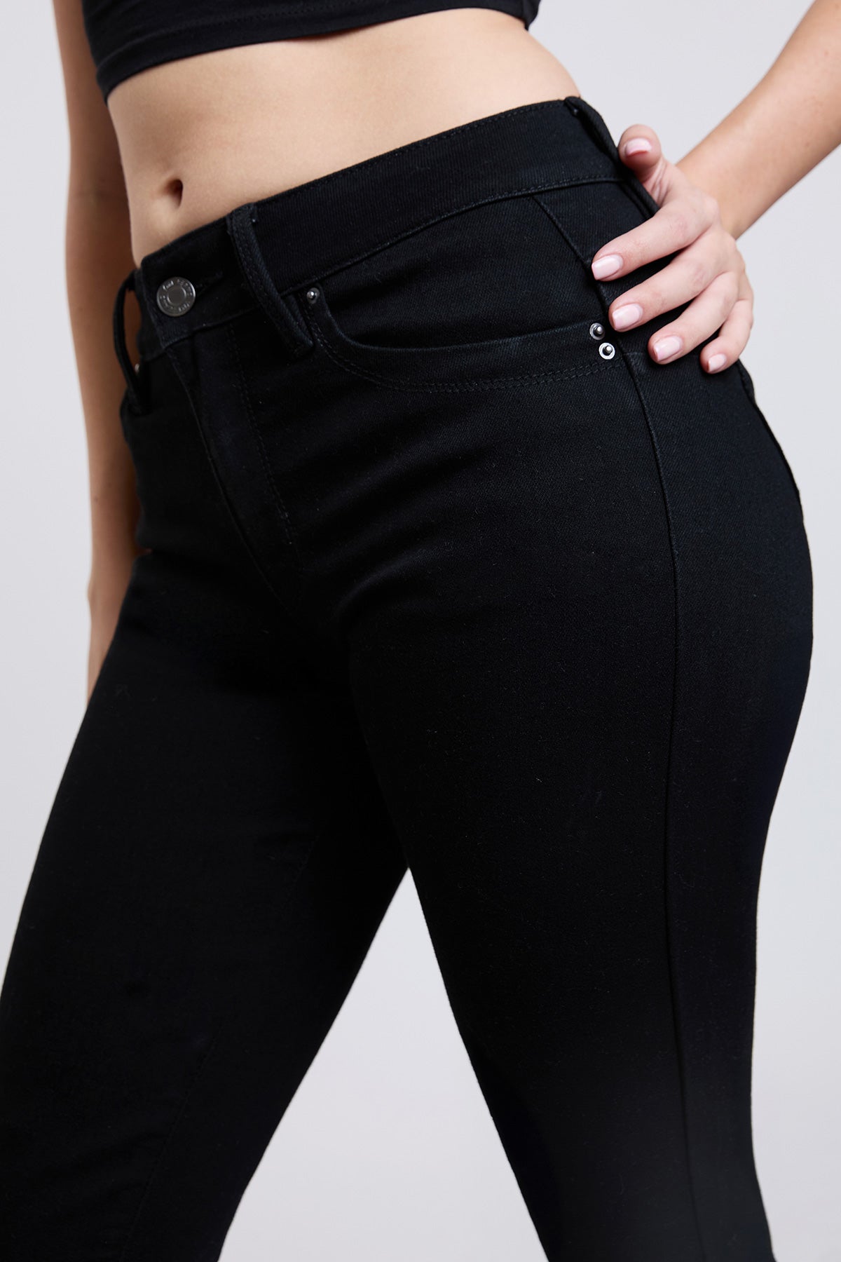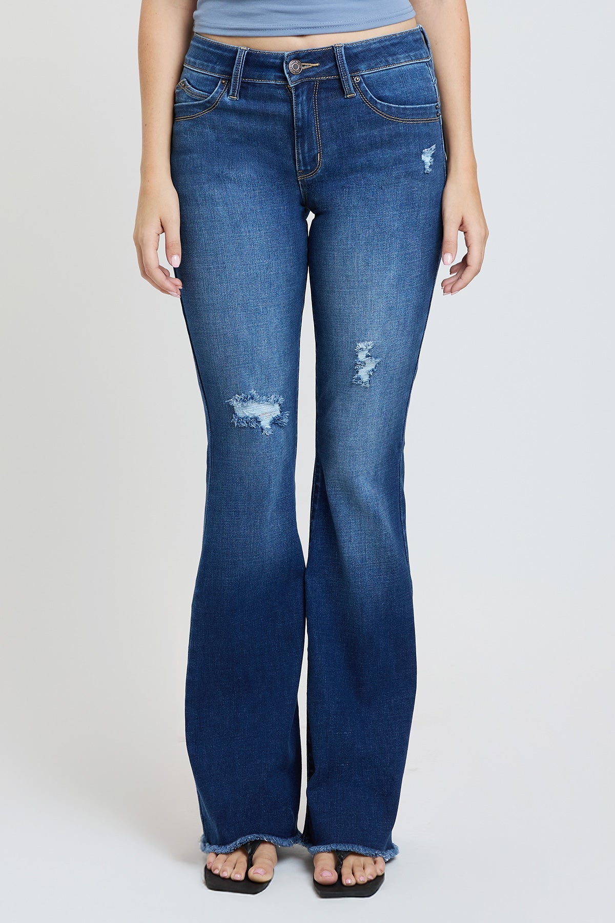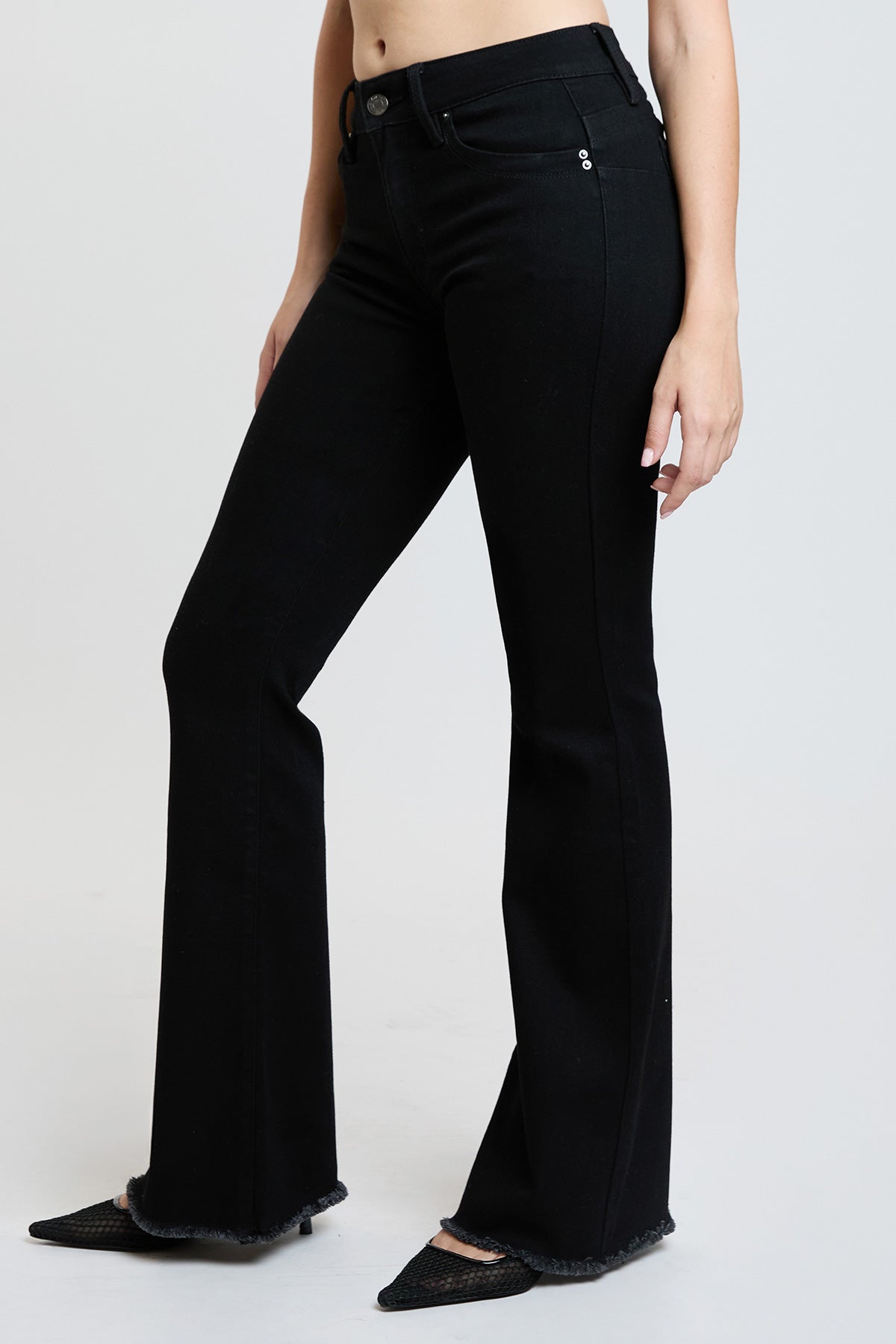 Take our Women's WannaBettaButt High-Rise Flare jean out on the town! These flared jeans feature our signature WBB heart-shaped stitching and uniquely crafted pockets for a natural butt-lift that you'll love. Made with recycled fibers because earth is bae <3. Detailed with a frayed and flared hem, light whiskering, and a distressed front. Style with a bodysuit and heels for a sultry vibe!