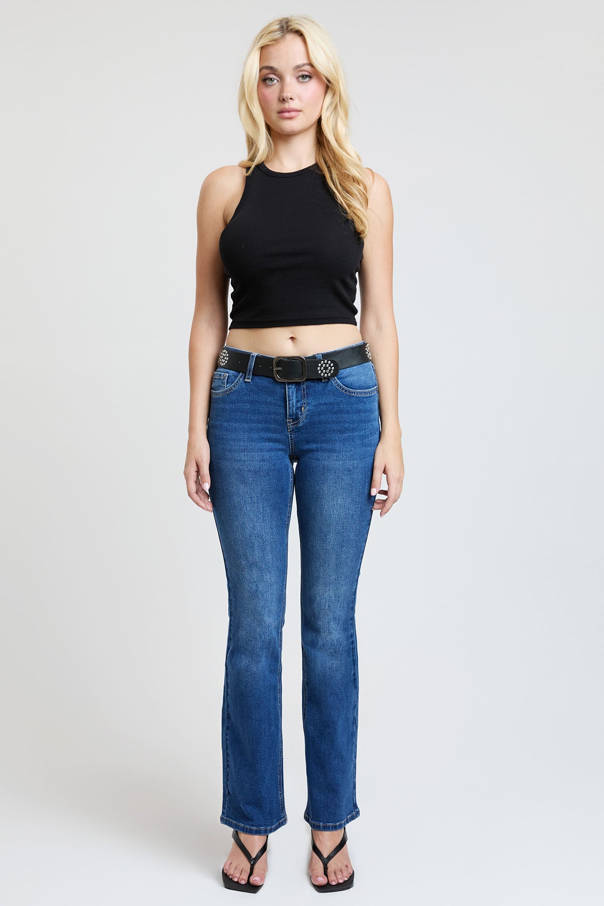 Elevate your everyday denim with our Women’s Mid Rise Belted Bootcut Jeans. Designed with a flattering mid-rise waist and classic bootcut leg, this pair offers a timeless silhouette with a modern twist. The included removable belt adds a stylish, adjustable touch, while the 5-pocket design and button-and-zipper fly keep it functional. With a full-length inseam and an 18" leg opening, these jeans are easy to dress up or down—making them a versatile staple for any day of the week.