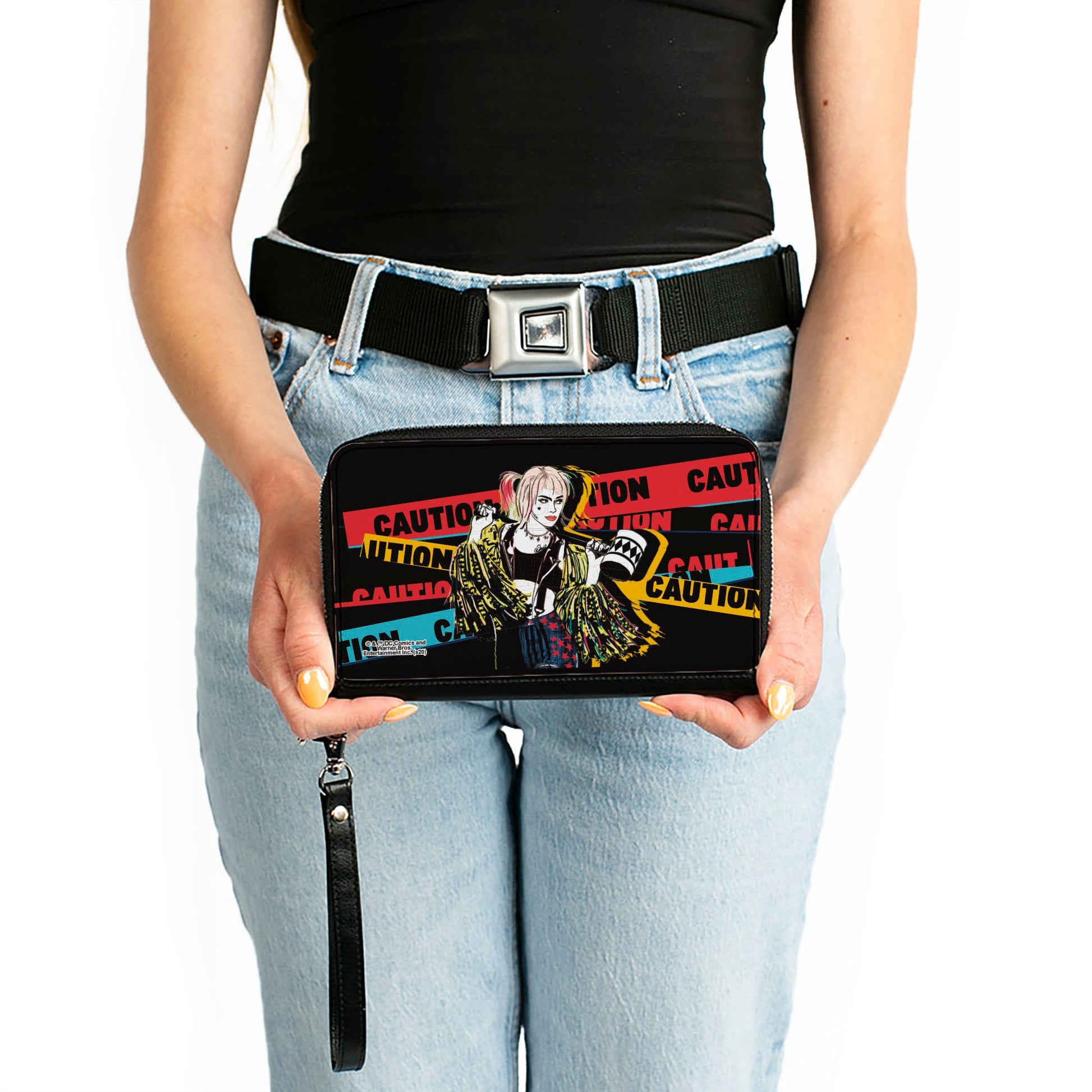 Women's PU Zip Around Wallet Rectangle - Birds of Prey Harley Quinn CAUTION Hammer Pose Black Red Yellow Blue