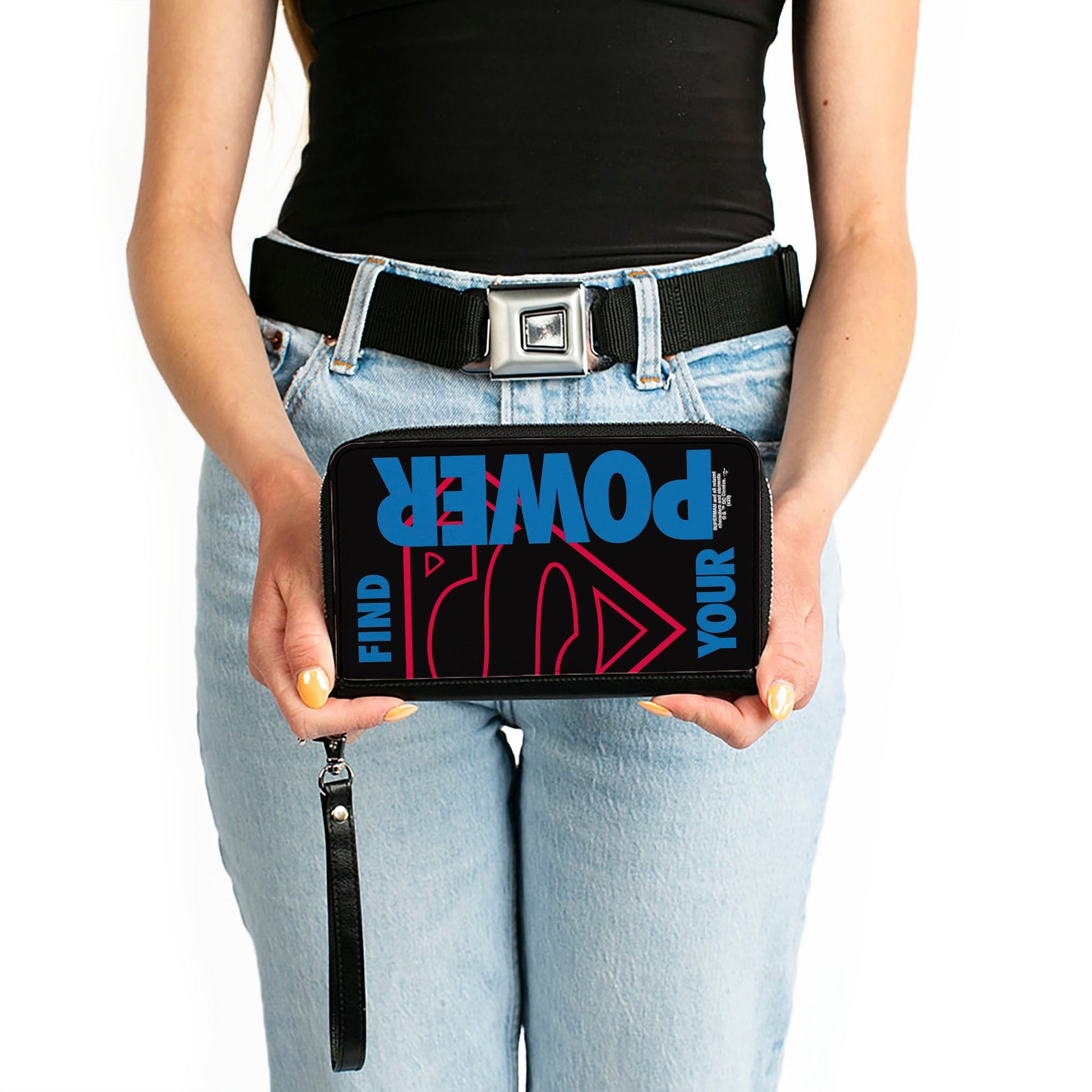 Women's PU Zip Around Wallet Rectangle - Superman Shield FIND YOUR POWER Black Red Blue