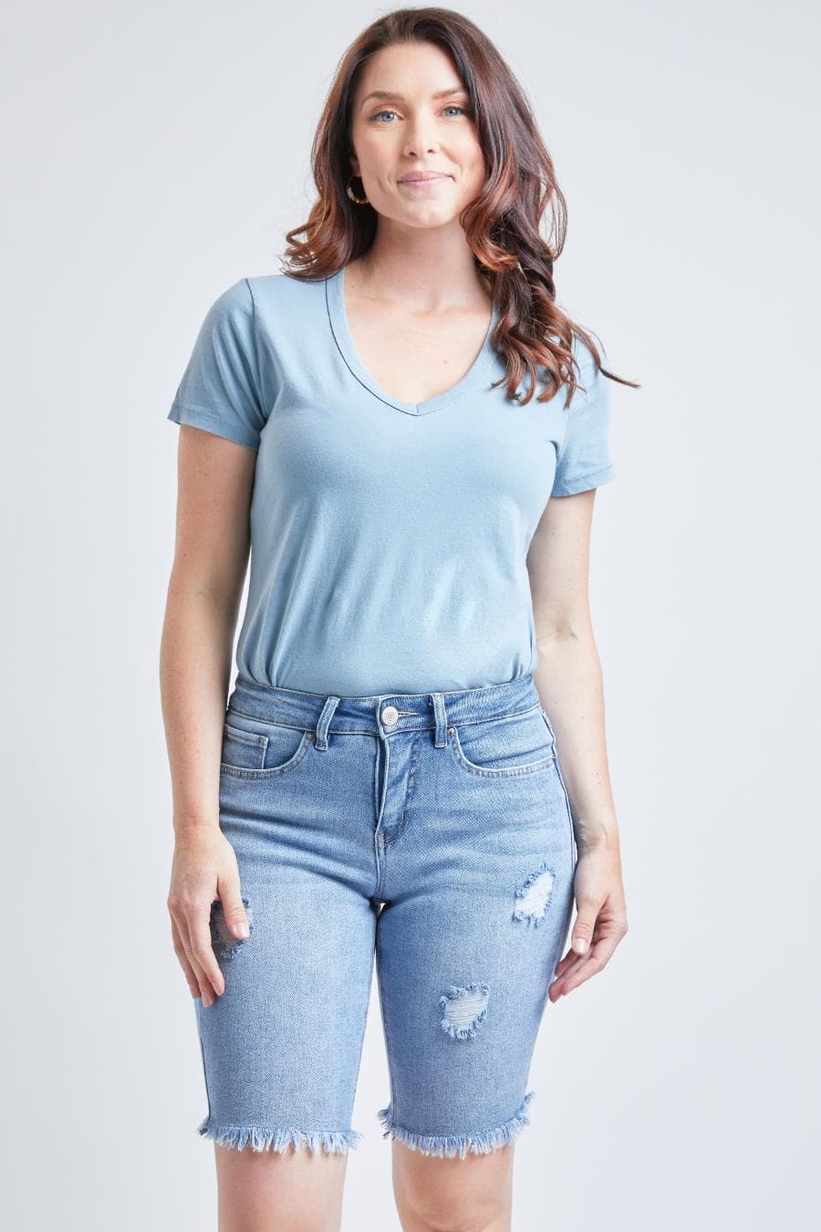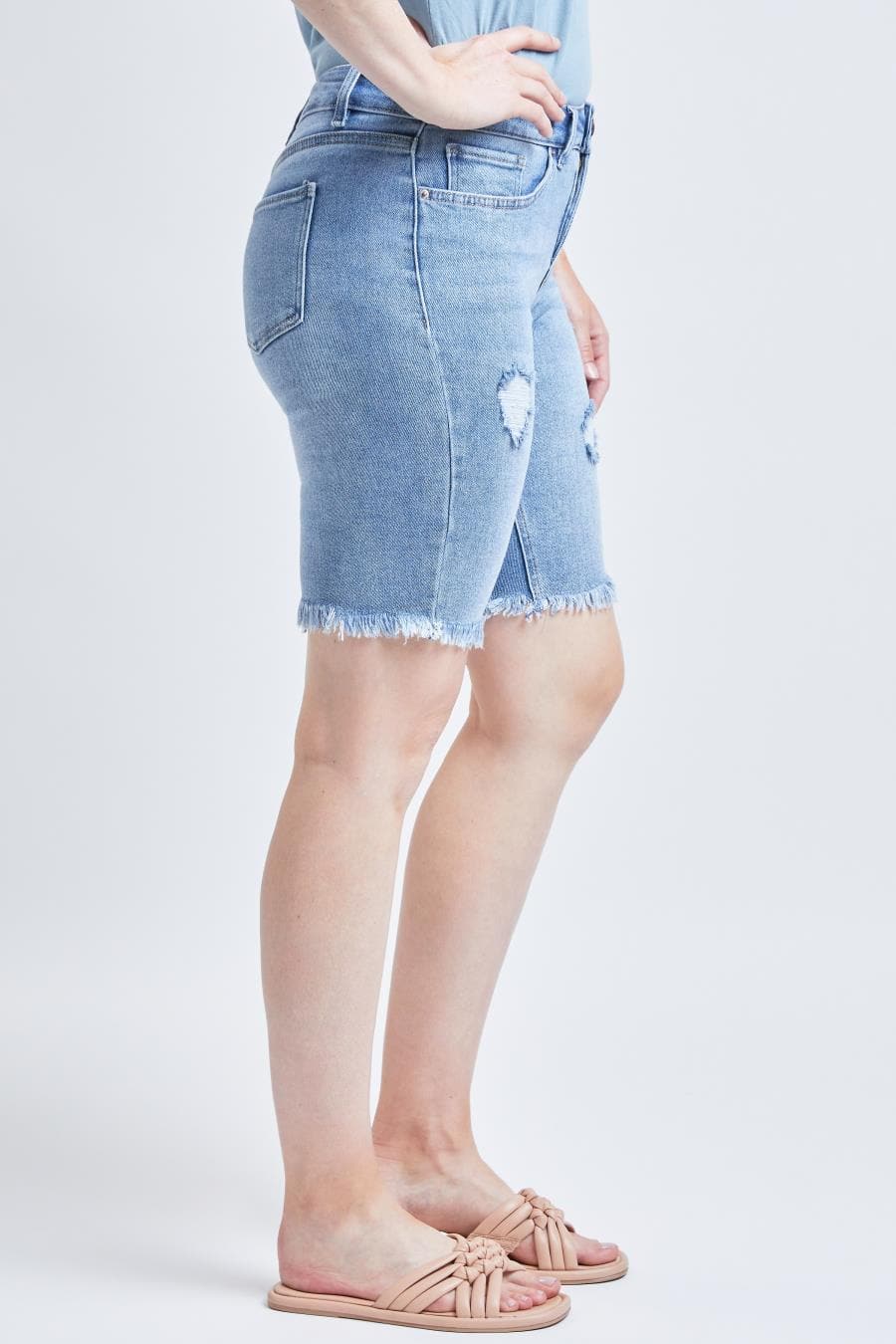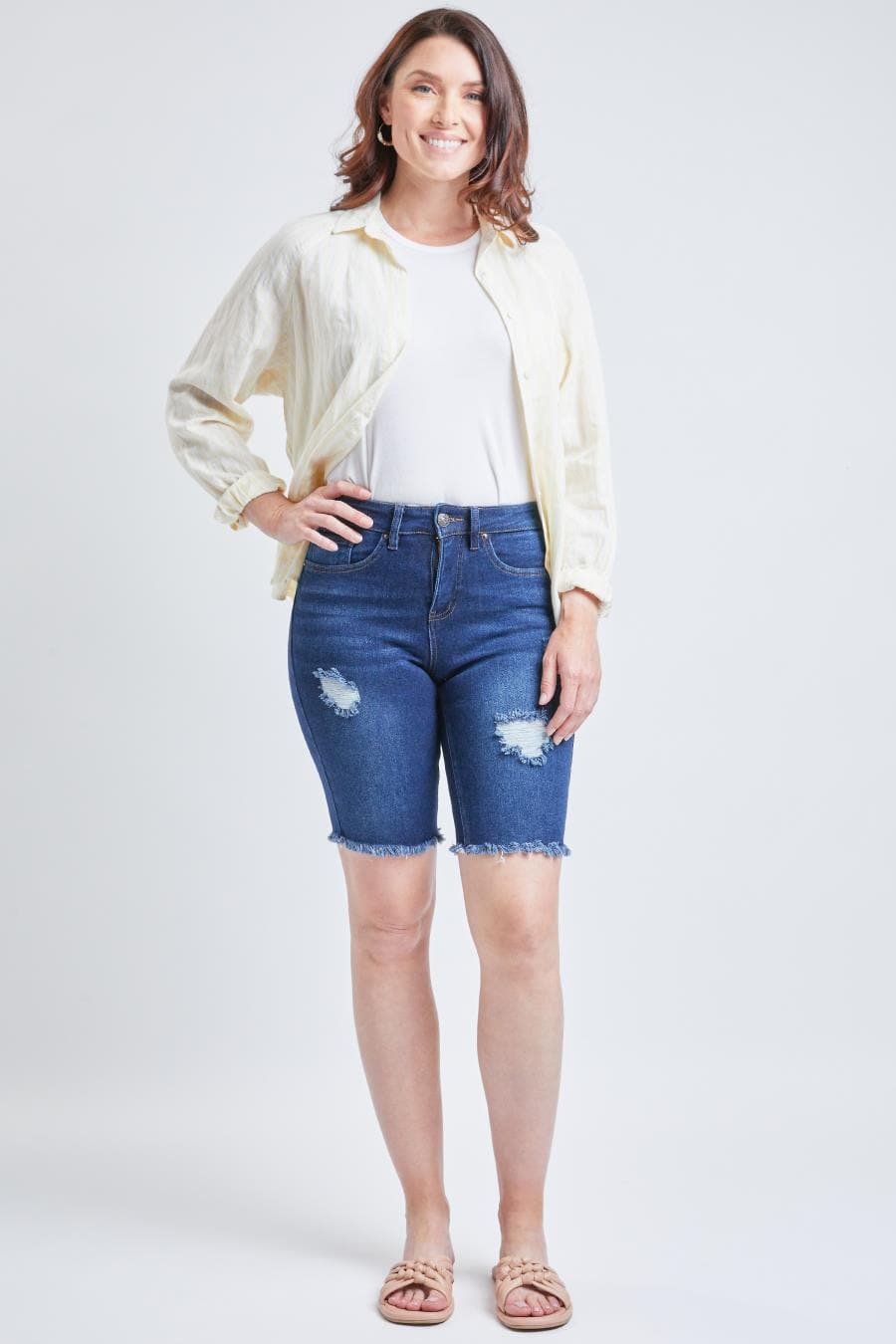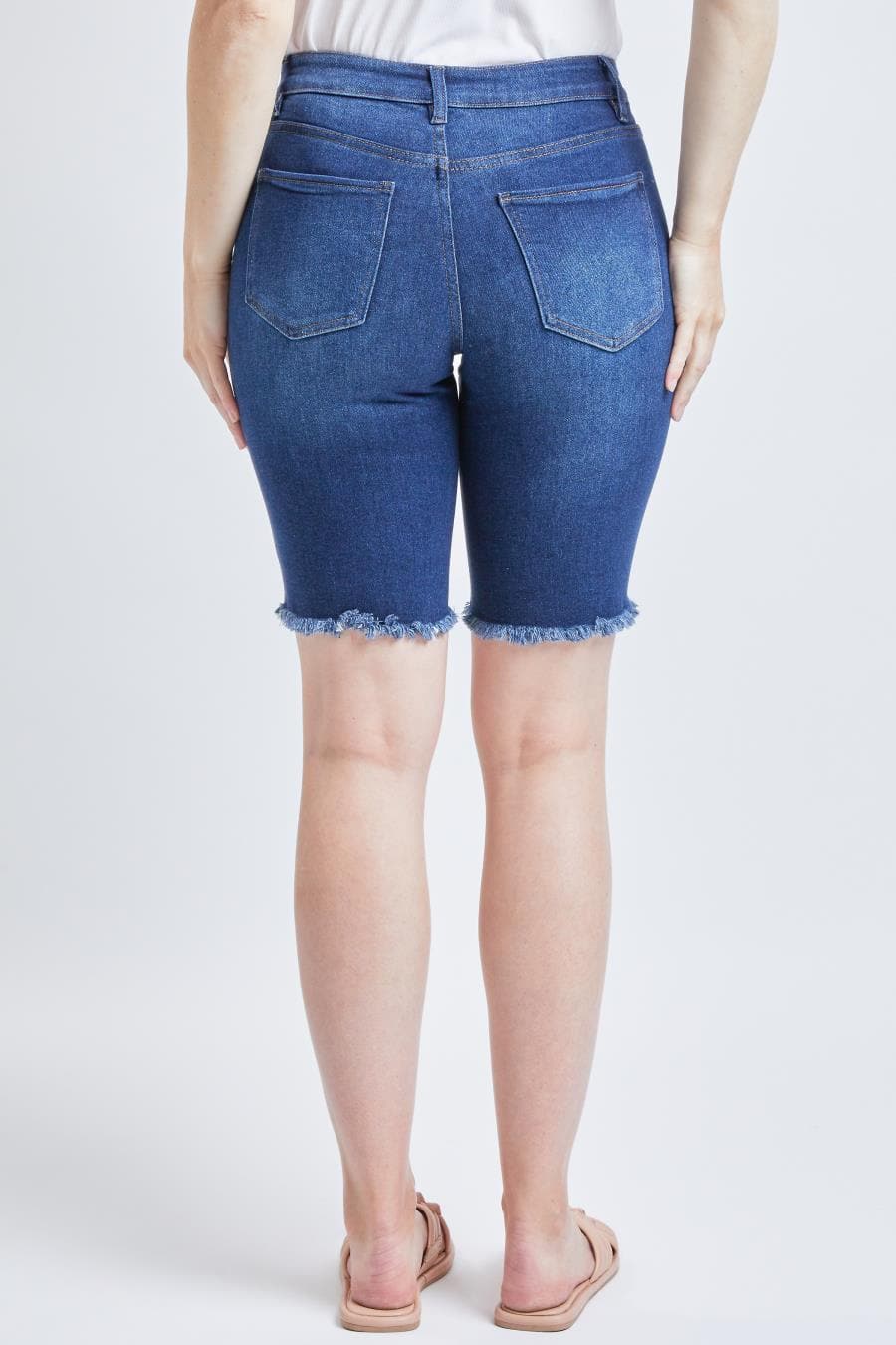 Our Women's Vintage Dream Bermuda Shorts With Frayed Hem feature a five-pocket construction, single-button closure with front zip, frayed hem, and belt loops. This garment contains LYCRA fiber for advanced stretch and is made of vintage denim. It moves with you throughout the day for a comfortable, flexible fit. Style with a tucked top and your favorite sandals for a cute staycation look.
