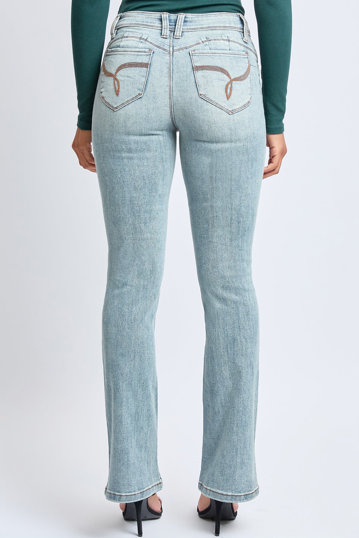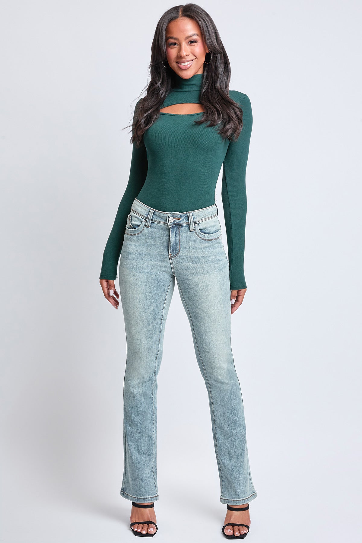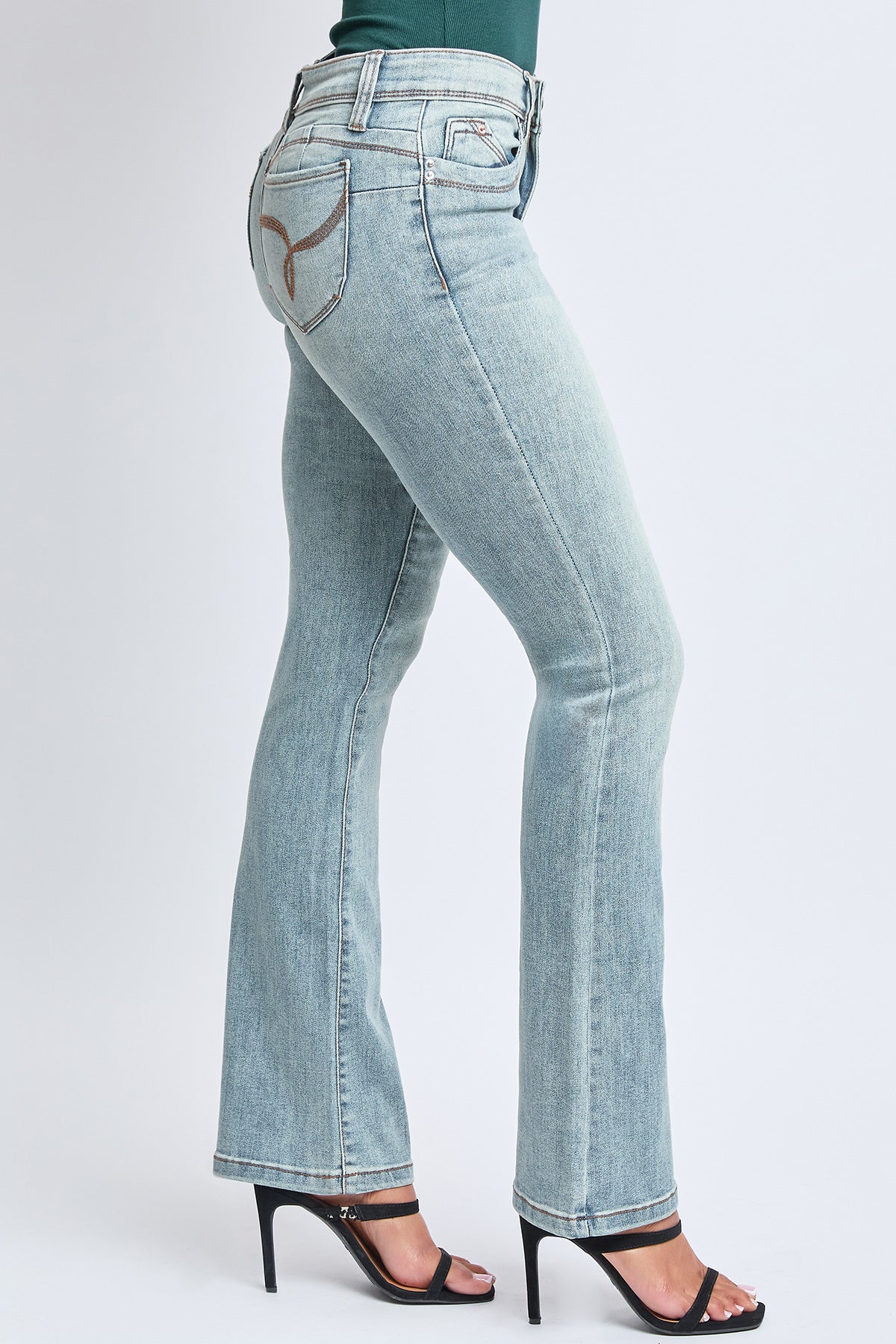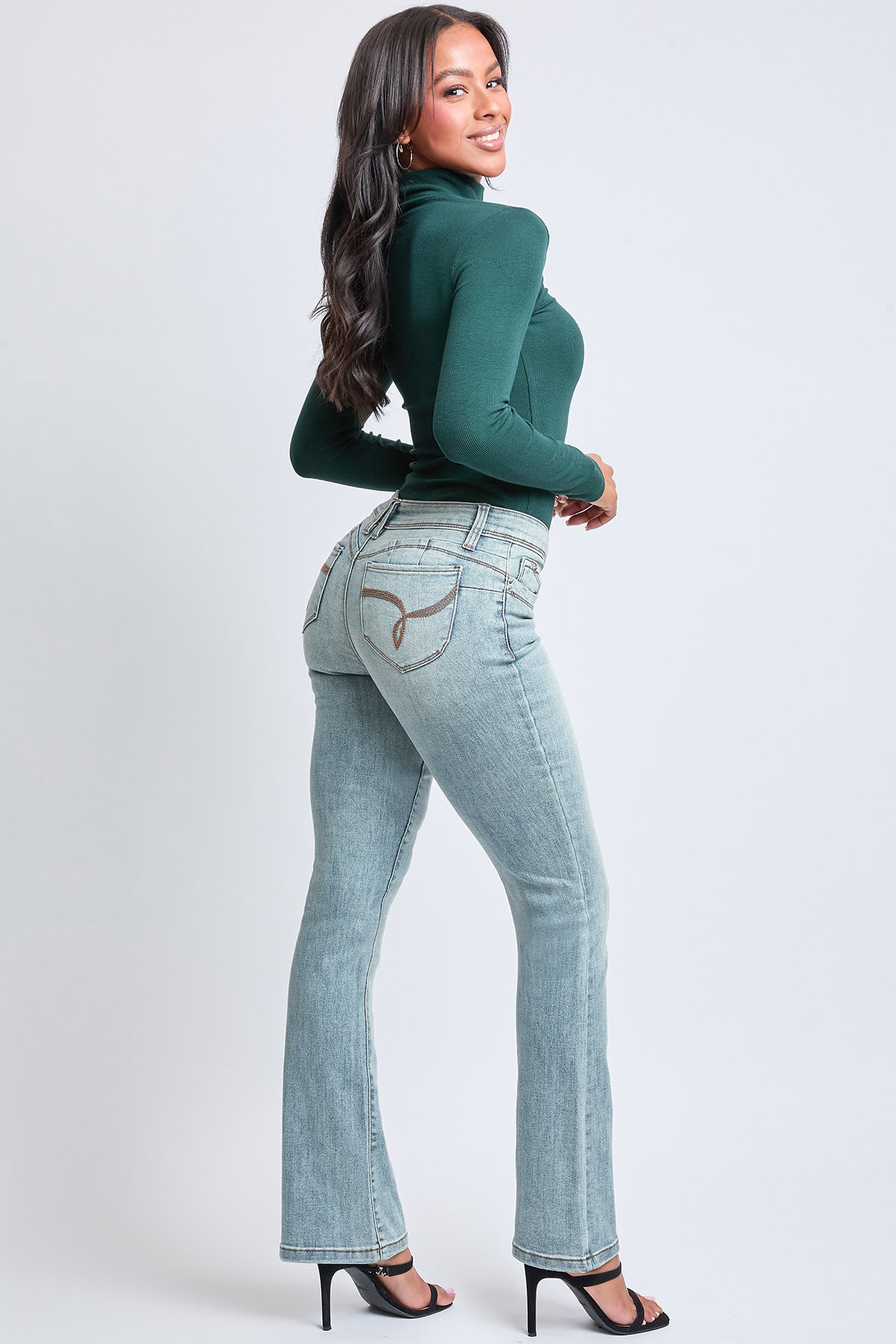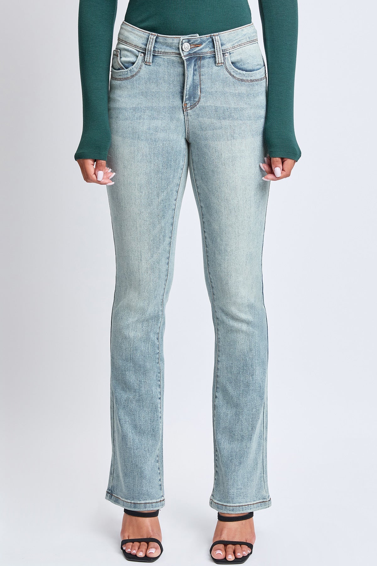 Women's WannaBettaButt Mid Rise Bootcut Jeans, designed to enhance your curves and top your style. With a mid-rise bootcut silhouette, these jeans offer a flattering fit for all body types. The 1-button closure with zipper ensures a secure and sleek finish, while the classic 5-pocket construction adds never-ending appeal.