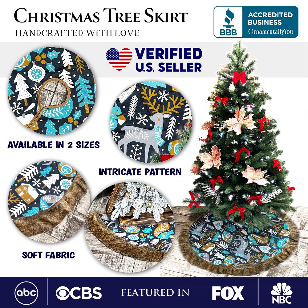 With vintage and finesse, our luxury woodland animal tree skirt features a wide array of different artistic winter concepts. On the exterior you can find ethnic foxes, squirrels, owls, snowflakes, spruce trees and bushes.